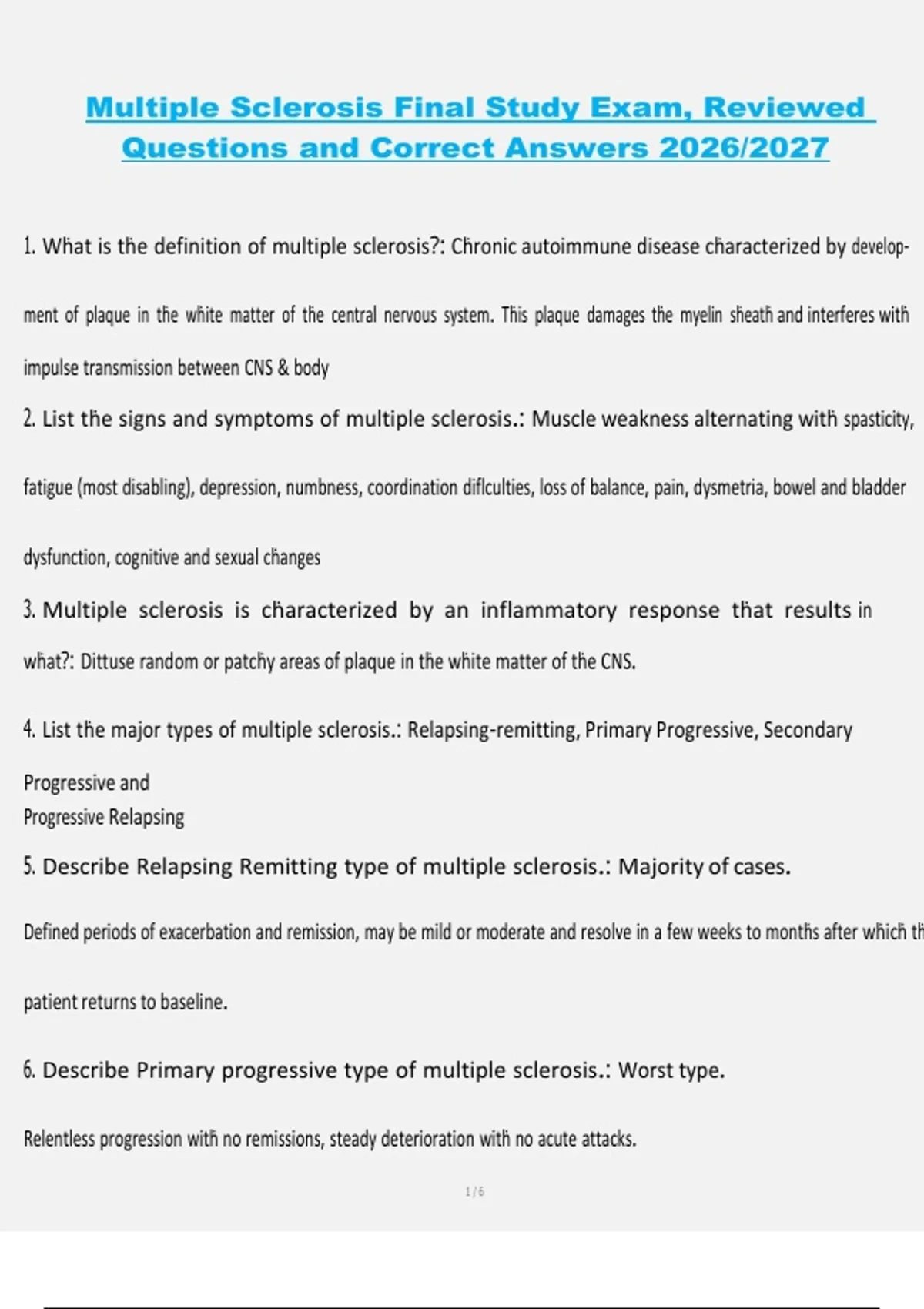 This final study exam focuses on Multiple Sclerosis and includes carefully reviewed exam-style questions with correct and reliable answers. It covers essential concepts, clinical knowledge, and exam-relevant topics to support thorough preparation for final assessments in the 2026/2027 academic year.