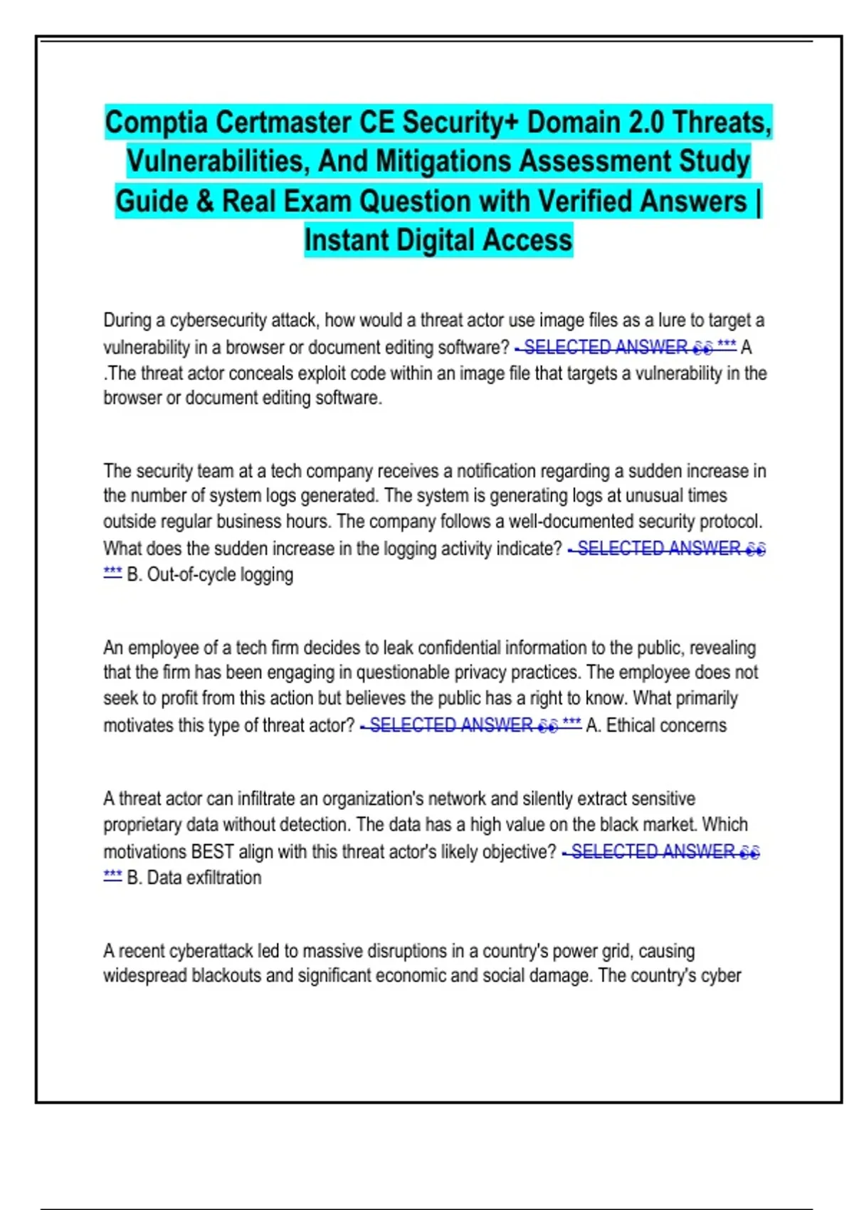 The CompTIA CertMaster CE Security+ Domain 2.0 Threats, Vulnerabilities, and Mitigations Assessment Study Guide & Real Exam Questions with Verified Answers is a comprehensive digital study resource designed for Security+ certified professionals seeking to renew their certification. It focuses specifically on Domain 2.0, covering threat actors, attack vectors, system vulnerabilities, indicators of malicious activity, and mitigation strategies. The guide includes detailed explanations, real exam-style questions, and verified answers, allowing learners to practice and reinforce applied cybersecurity knowledge. With instant digital access, it provides a convenient, self-paced study tool to ensure mastery of the material and successful completion of the CertMaster CE assessment.