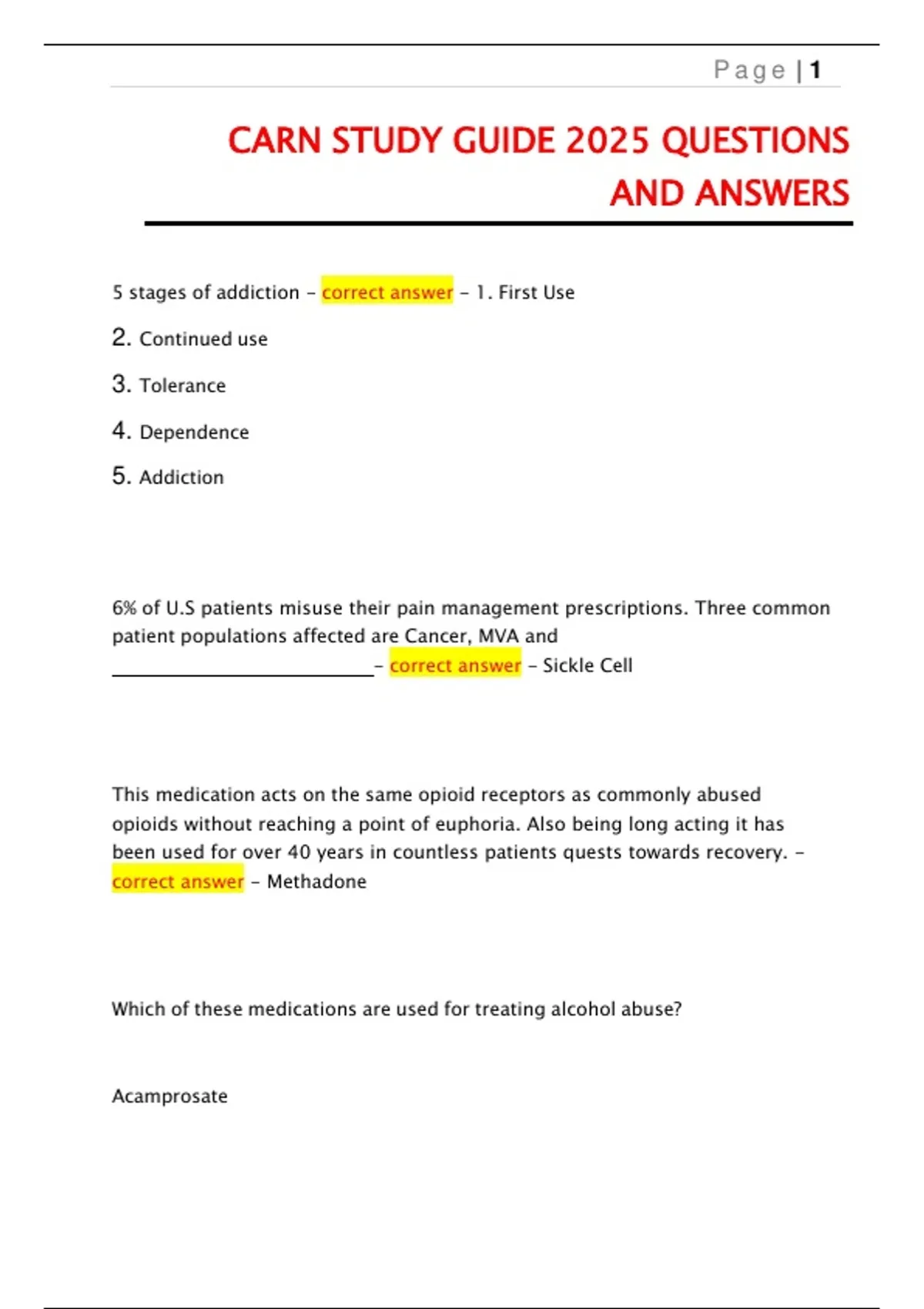 The CARN Study Guide 2025 Questions and Answers resource offers 100% correct verified responses with latest 2025 updates for Certified Addictions Registered Nurse certification. Featuring accurate exam-style questions, detailed rationales, and explanations, it's designed for effective CARN prep, study guide support, and confident performance. Trusted by addictions nursing professionals, it ensures comprehensive practice across CARN topics for exam success.