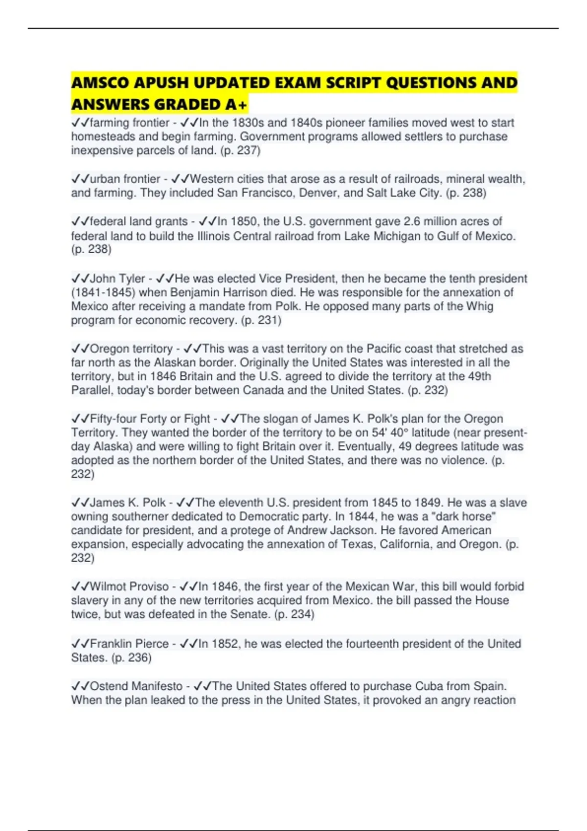 AMSCO APUSH UPDATED EXAM SCRIPT QUESTIONS AND ANSWERS GRADED A+
