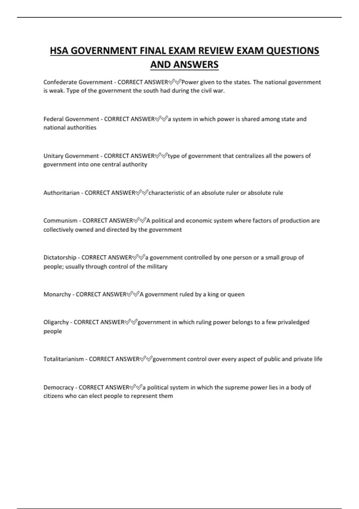 HSA GOVERNMENT FINAL EXAM REVIEW EXAM QUESTIONS AND ANSWERS