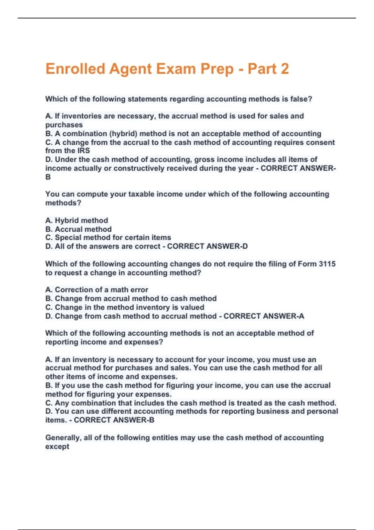 Which of the following statements regarding accounting methods is false? A. If inventories are necessary, the accrual method is used for sales and purchases B. A combination (hybrid) method is not an acceptable method of accounting C. A change from the accrual to the cash method of accounting requires consent from the IRS D. Under the cash method of accounting, gross income includes all items of income actually or constructively received during the year - CORRECT ANSWERB You can compute your taxable income under which of the following accounting methods? A. Hybrid method B. Accrual method C. Special method for certain items D. All of the answers are correct - CORRECT ANSWER-D Which of the following accounting changes do not require the filing of Form 3115 to request a change in accounting method? A. Correction of a math error B. Change from accrual method to cash method C. Change in the method inventory is valued D. Change from cash method to accrual method - CORRECT ANSWER-A Which of the following accounting methods is not an acceptable method of reporting income and expenses? A. If an inventory is necessary to account for your income, you must use an accrual method for purchases and sales. You can use the cash method for all other items of income and expenses. B. If you use the cash method for figuring your income, you can use the accrual method for figuring your expenses. C. Any combination that includes the cash method is treated as the cash method. D. You can use different accounting methods for reporting business and personal items. - CORRECT ANSWER-B Generally, all of the following entities may use the cash method of accounting exceptA. A family farming corporation with gross receipts of $25 million or less. B. An entity with no inventories and average gross receipts of $5 million or less. C. A qualified personal service corporation. D. A corporation that has long-term contracts. - CORRECT ANSWER-D A cash-basis taxpayer should report gross income A. Only for the year in which income is actually received in cash. B. For the year in which income is either actually or constructively received in cash only. C. Only for the year in which income is actually received whether in cash or in property. D. For the year in which income is either actually or constructively received, whether in cash or in property. - CORRECT ANSWER-D Erin earned $1000 in interest in 2014. Erin withdrew $700 in 2015 and $300 in 2016. How much of the original $1000 should Erin report as interest earned in 2016? A. $0 B. $300 C. $700 D. $1000 - CORRECT ANSWER-A Which of the following statements is not correct? A. Under an accrual method of accounting, you generally report income in the year earned and deduct or capitalize expenses in the year incurred. B. Under an accrual method of accounting, you generally report receipt of an advance payment for services to be performed over 3 or more years as income in the year you receive payment. C. Under an accrual method of accounting, business expenses and interest owed to a related person who uses the cash method of accounting are deductible when the all-events test has been met. D. Under an accrual method of accounting, you can take a current deduction for taxes when economic performance occurs. - CORRECT ANSWER-C Generally, a substantial business inventory requires use of which method of accounting? A. Cash B. Hybrid C. Accrual D. None of the answers are correct - CORRECT ANSWER-CJohn is a cash-basis taxpayer. He received the following items of income in December 2016: 1. The loan on his truck was forgiven because he performed accounting work for the dealer. He owed $2000 at the time. 2. A retainer of $500 from a new client to guarantee that his services would be available in February when the client would need help preparing financial statements. 3. The $800 for work he completed in November 2015. How much of this income must John include on his 2016 tax return? A. $500 B. $1300 C. $2500 D. $3300 - CORRECT ANSWER-D