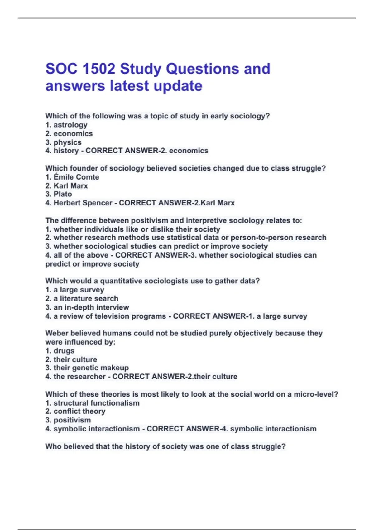 Which of the following was a topic of study in early sociology? 1. astrology 2. economics 3. physics 4. history - CORRECT ANSWER-2. economics Which founder of sociology believed societies changed due to class struggle? 1. Émile Comte 2. Karl Marx 3. Plato 4. Herbert Spencer - CORRECT ANSWER-2.Karl Marx The difference between positivism and interpretive sociology relates to: 1. whether individuals like or dislike their society 2. whether research methods use statistical data or person-to-person research 3. whether sociological studies can predict or improve society 4. all of the above - CORRECT ANSWER-3. whether sociological studies can predict or improve society Which would a quantitative sociologists use to gather data? 1. a large survey 2. a literature search 3. an in-depth interview 4. a review of television programs - CORRECT ANSWER-1. a large survey Weber believed humans could not be studied purely objectively because they were influenced by: 1. drugs 2. their culture 3. their genetic makeup 4. the researcher - CORRECT ANSWER- culture Which of these theories is most likely to look at the social world on a micro-level? 1. structural functionalism 2. conflict theory 3. positivism 4. symbolic interactionism - CORRECT ANSWER-4. symbolic interactionism Who believed that the history of society was one of class struggle?1. Émile Durkheim 2. Karl Marx 3. Erving Goffmann 4. George Herbert Mead - CORRECT ANSWER-2. Karl Marx Who coined the phrase symbolic interactionism? 1. Herbert Blumer 2. Max Weber 3. Lester F. Ward 4. W. I. Thomas - CORRECT ANSWER-1. Herbert Blumer A symbolic interactionist may compare social interactions to: 1. behaviours 2. conflicts 3. human organs 4. theatrical roles - CORRECT ANSWER-4. Theatrical roles Which research technique would most likely be used by a symbolic interactionist? 1. surveys 2. participant observation 3. quantitative data analysis 4. none of the above - CORRECT ANSWER-2. participant observation Which sociologist described sociology as the study of social forms? 1. Martineau 2. Simmel 3. Weber 4. Becker - CORRECT ANSWER-2. Simmel Which of the following best describes sociology as a subject? 1. the study of individual behaviour 2. the study of cultures 3. the study of society and social interaction 4. the study of economics - CORRECT ANSWER-3. the study of society and social interaction Wright Mills once said that sociologists need to develop a sociological __________ to study how society affects individuals. 1. culture 2. imagination 3. method - CORRECT ANSWER-2. ImaginationA sociologist defines society as a group of people who reside in a defined area, share a culture, and who: 1. interact 2. work in the same industry 3. speak different languages 4. practise a recognized religion - CORRECT ANSWER-1. interact Seeing patterns means that a sociologist needs to be able to: 1. compare the behaviour of individuals from different societies 2. compare one society to another 3. identify similarities in how social groups respond to social pressure 4. compare individuals to groups - CORRECT ANSWER-3. identify similarities in how social groups respond to social pressure Studying Sociology helps people analyze data because they learn: 1. interview techniques 2. to apply statistics 3. to generate theories 4. all of the above - CORRECT ANSWER-4. All of the above Berger describes sociologists as concerned with: 1. monumental moments in people's lives 2. common everyday life events 3. both a and b 4. none of the above - CORRECT ANSWER-3. both be and c A measurement is considered ______ if it actually measures what it is intended to measure, according to the topic of the study. 1. reliable 2. sociological 3. valid 4. quantitative - CORRECT ANSWER-3. valid Sociological studies test relationships in which change in one ______ causes change in another. 1. test subject 2. behaviour 3. variable 4. operational definition - CORRECT ANSWER-3. variable