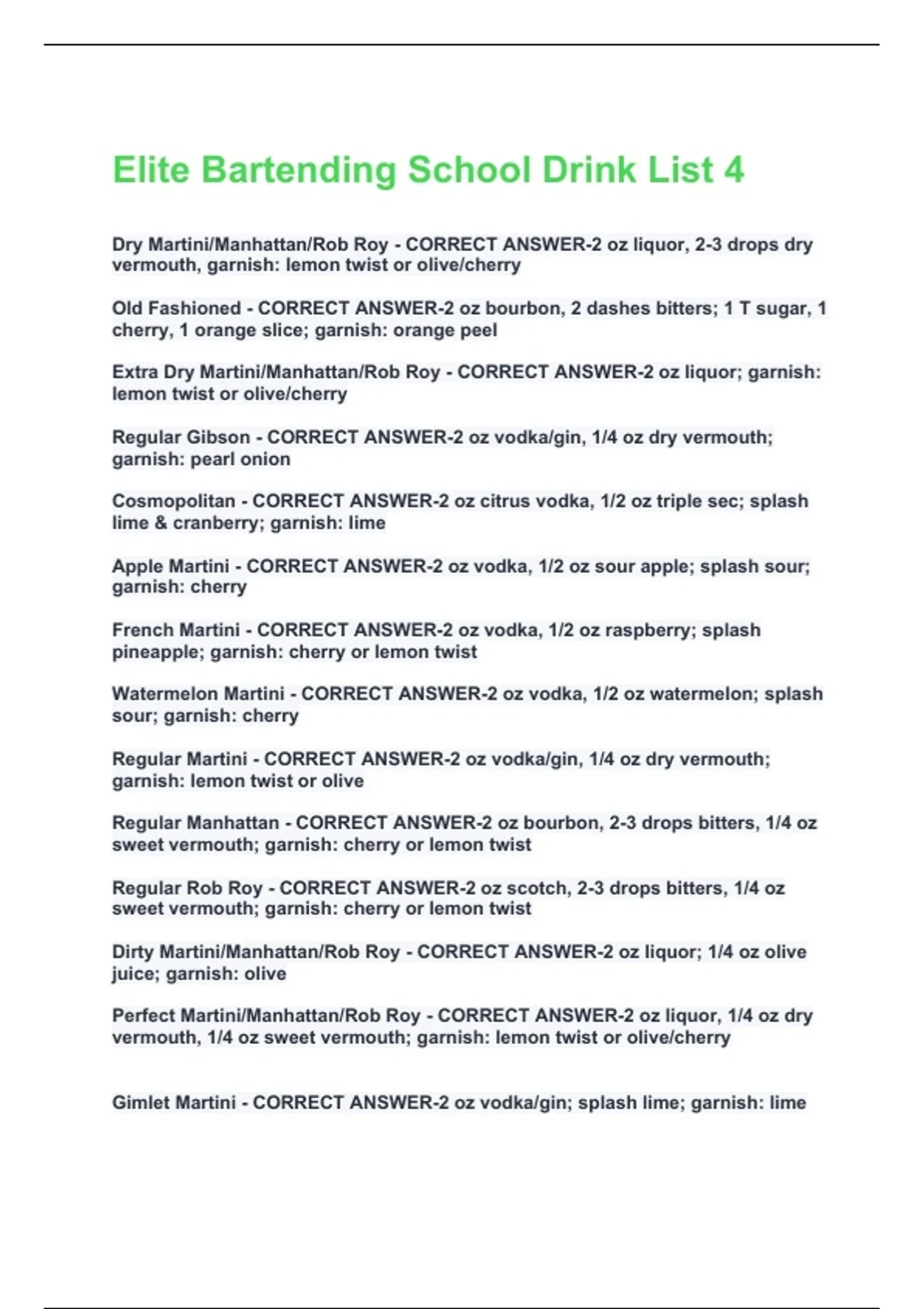 Elite Bartending School Drink List 4 Questions & Answers Solved 100% Correct!!