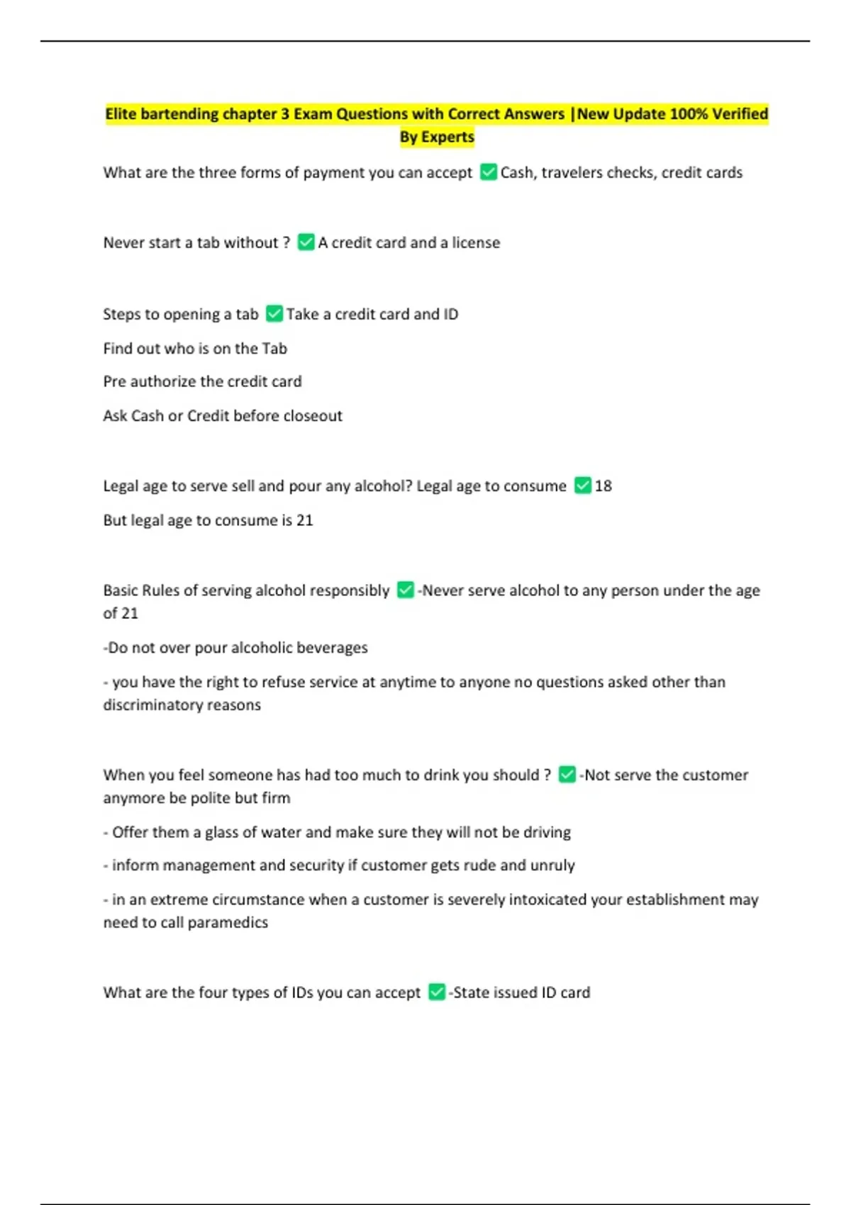 Elite bartending chapter 3 Exam Questions with Correct Answers |New Update 100% Verified