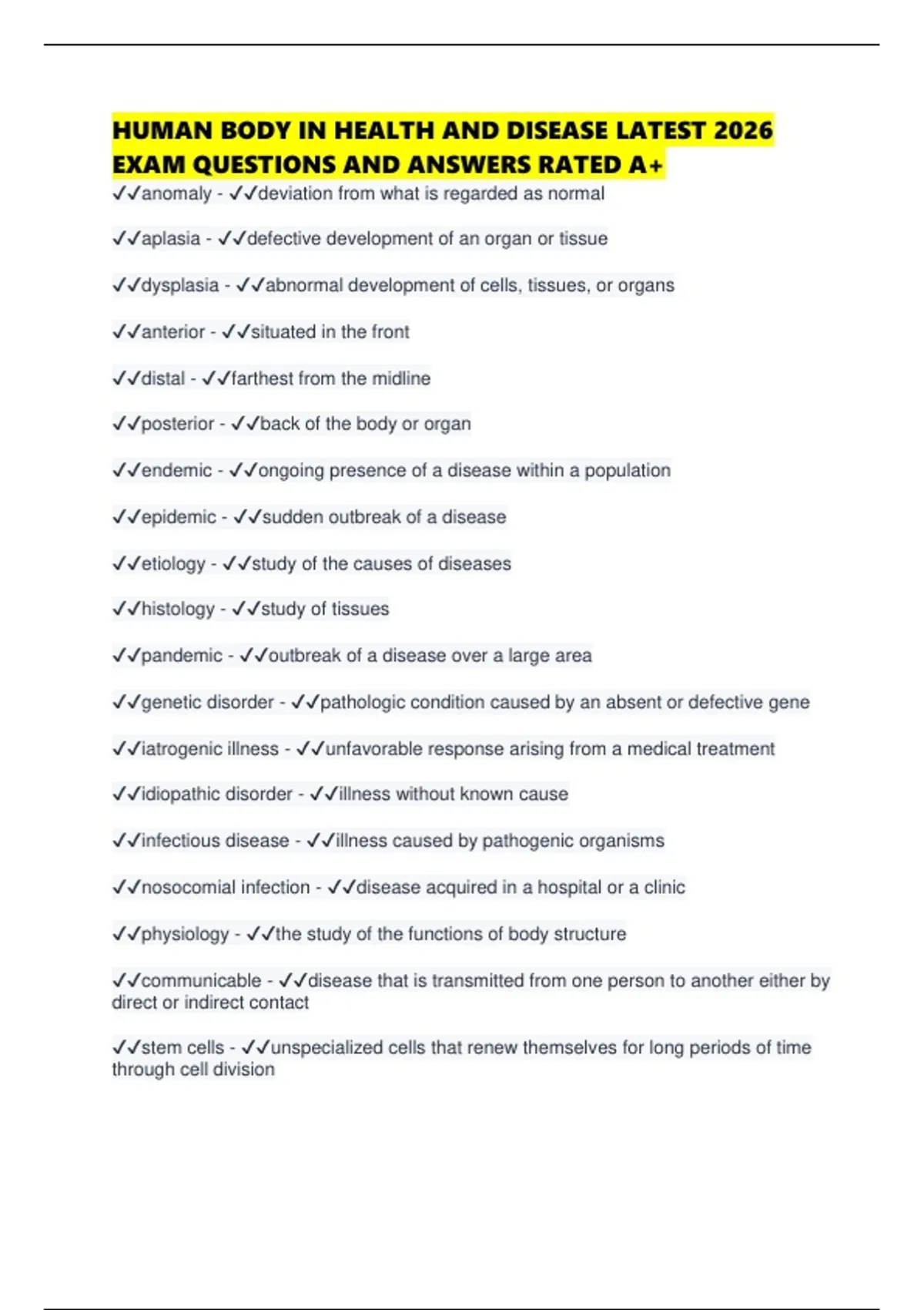 HUMAN BODY IN HEALTH AND DISEASE LATEST 2026 EXAM QUESTIONS AND ANSWERS RATED A+