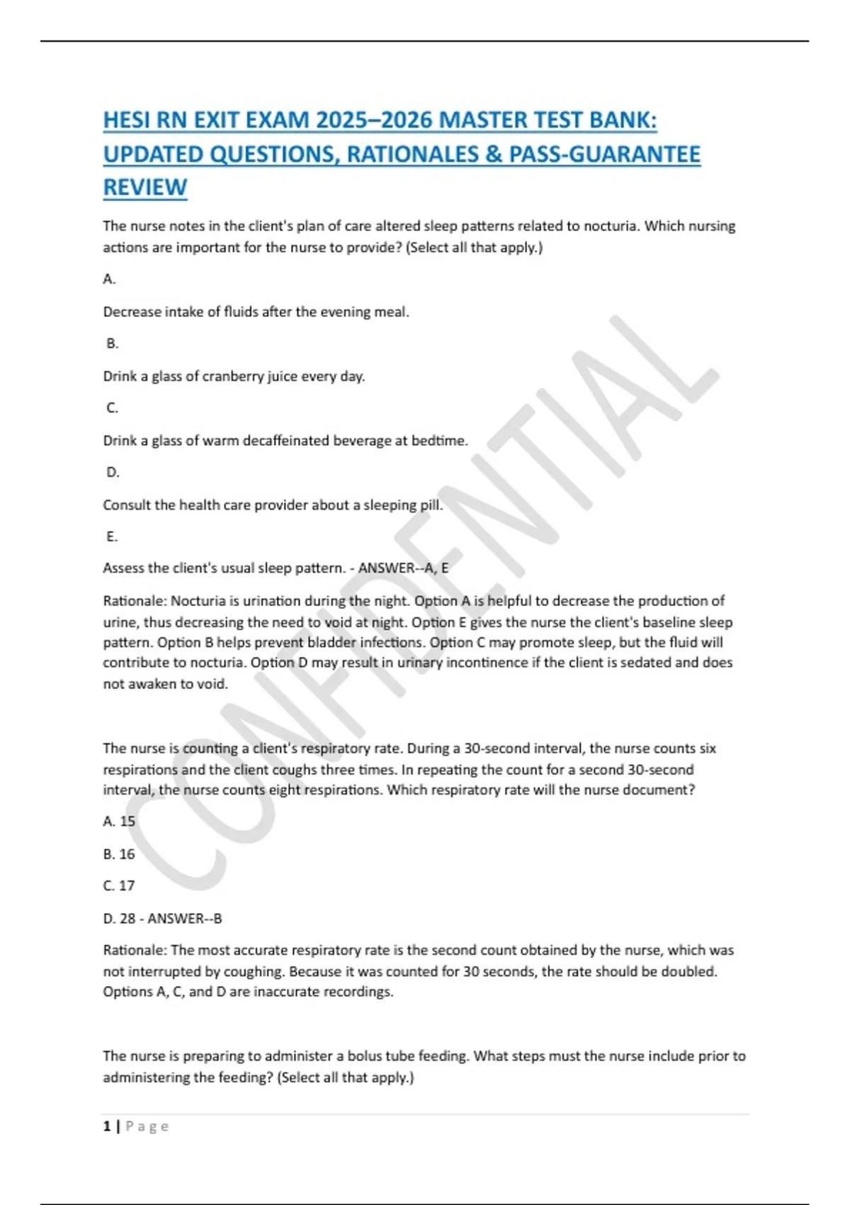 Master the HESI RN Exit Exam with this updated 2025–2026 test bank featuring comprehensive practice questions, verified answers, and detailed rationales. Designed for nursing students and graduates, this resource covers critical areas such as patient safety, clinical judgment, delegation, pharmacology, infection control, and ethical practice. Each question includes clear explanations to strengthen reasoning skills and boost confidence for exam day. Ideal for focused review, self-assessment, and last-minute prep to ensure success on the HESI and NCLEX-RN.
