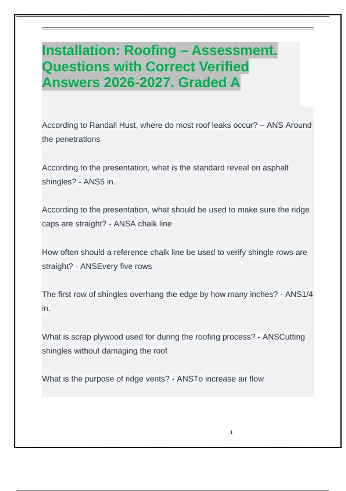 Installation: Roofing – Assessment, Questions with Correct Verified Answers, 2026–2027, is a comprehensive evaluation resource covering key roofing installation techniques, materials, safety practices, and industry standards. It features clearly organized questions with verified, correct answers to support effective learning and mastery. Graded A, this material serves as a reliable study and review tool for students and professionals aiming to strengthen their knowledge and excel in roofing installation assessments.
