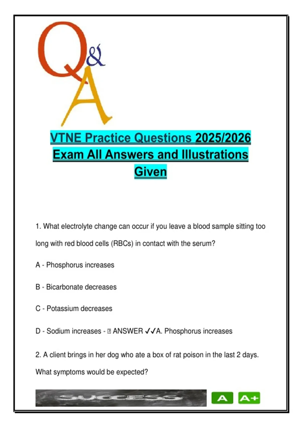 This document presents 120 expertly selected and fully answered multiple-choice questions to help students prepare for the Veterinary Technician National Exam (VTNE), following the structure and standards of the VET-TECH 450 course. The questions span key areas of veterinary technology, including pharmacology, anesthesia, diagnostic imaging, surgical nursing, laboratory procedures, pathology, physiology, and medical terminology. Each question includes the correct answer clearly marked, allowing for efficient self-assessment and focused study. The content is designed to closely simulate the official VTNE format, offering practical preparation and reinforcing critical concepts tested on the exam. This study resource is ideal for: Students enrolled in Veterinary Technology, Animal Health, or Veterinary Nursing programs Learners in Pre-veterinary, Animal Science, or Zoology fields Veterinary assistants and technician trainees seeking exam-style practice Students in clinical subjects such as Lab Animal Science, Surgical Assisting, or Clinical Pathology Whether used for independent review, classroom reinforcement, or certification prep, this document provides reliable, exam-focused material to boost confidence and readiness. Keywords: VTNE practice, veterinary technician, vet tech exam prep, pharmacology vet, anesthesia veterinary, diagnostic imaging, veterinary pathology, lab procedures vet, animal diseases, veterinary calculations, clinical veterinary questions, animal health technician, vet nursing exam, VET-TECH 450