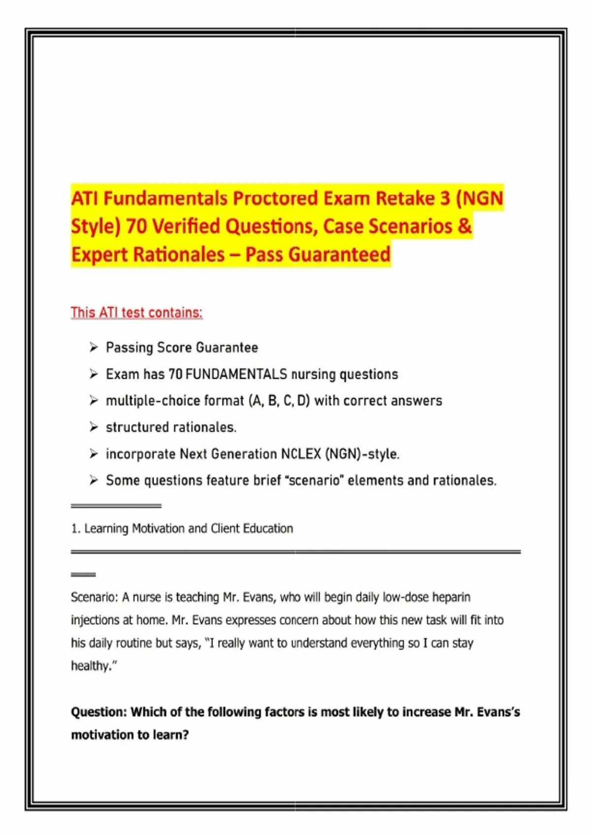 ATI Fundamentals Proctored Exam Retake 3 (NGN Style) 70 Verified Questions, Case Scenarios & Expert Rationales – Pass Guaranteed Prepare with confidence for your ATI Fundamentals Proctored Exam Retake 3 using this Next Generation NCLEX (NGN) style resource, designed to mirror the actual exam format and guarantee success. This prep set includes 70 verified multiple‑choice questions (MCQs), case scenarios, and expert‑verified rationales to ensure you’re ready to pass on the first attempt. Features: - 70 Actual Questions & Answers with structured rationales - 100% Pass Guarantee for exam readiness - NGN‑Style Case Scenarios integrated into the question set - Expert‑Verified Rationales explaining correct and incorrect answers - Evidence‑Based Content aligned with ATI and NCLEX standards - Accessible Format for flexible study anytime, anywhere Sample Topics Covered: - Client Education & Motivation: Factors that increase learning motivation in self‑care (heparin injections) - Assessment Skills: Weber’s test technique, priority findings in stroke clients, sterile field setup - Nutrition & Prevention: Osteoporosis risk reduction strategies, progression from clear to full liquid diets - Medication Safety: NG tube administration protocols, MAR checks for safe med administration - Critical Findings: Recognizing priority signs of anaphylaxis and immediate intervention