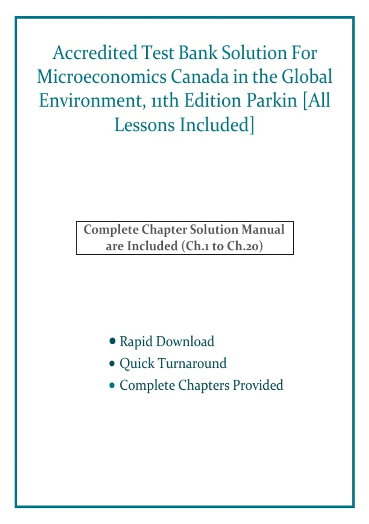 This document provides a full set of accredited test bank solutions for Microeconomics Canada in the Global Environment, 11th Edition by Parkin, covering all lessons in the textbook. It includes detailed answers to multiple-choice questions, short answer problems, and case study applications aligned with each chapter. Ideal for instructors and students seeking comprehensive solution support for exam preparation and concept reinforcement.