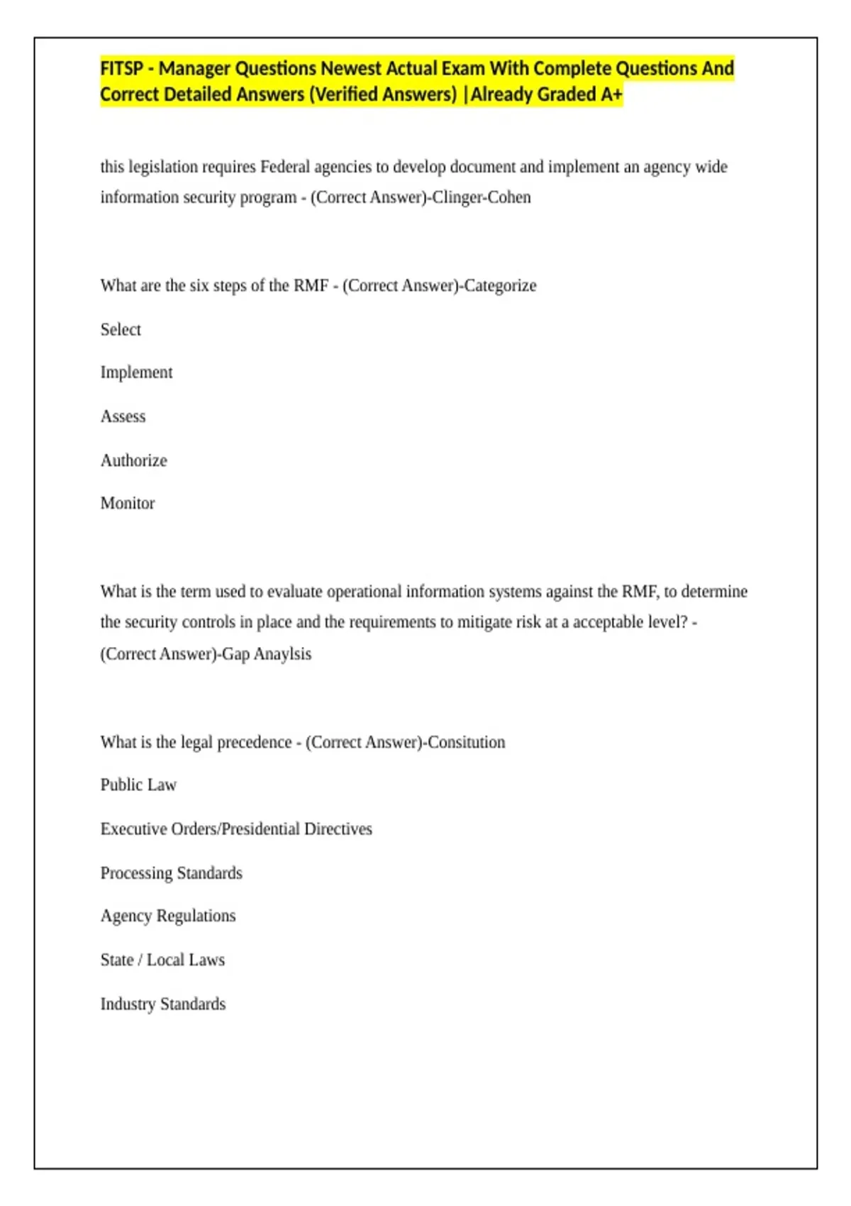 FITSP - Manager Questions Newest Actual Exam With Complete Questions And Correct Detailed Answers (Verified Answers) |Already Graded A+