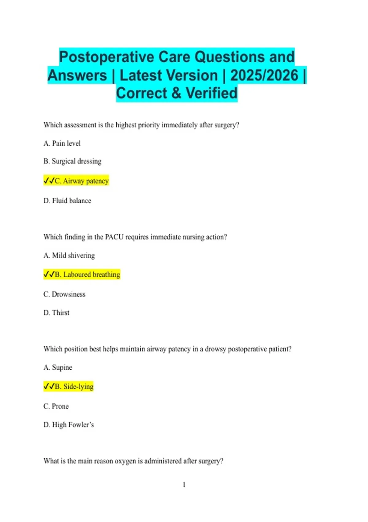 Postoperative Care Questions and Answers | Latest Version | 2025/2026 | Correct & Verified Which assessment is the highest priority immediately after surgery? A. Pain level B. Surgical dressing C. Airway patency D. Fluid balance Which finding in the PACU requires immediate nursing action? A. Mild shivering B. Laboured breathing C. Drowsiness D. Thirst Which position best helps maintain airway patency in a drowsy postoperative patient? A. Supine B. Side-lying C. Prone D. High Fowler’s What is the main reason oxygen is administered after surgery? 2 A. Reduce anxiety B. Increase comfort C. Prevent hypoxia D. Improve appetite Which sign indicates effective pain control? A. Guarding B. Restlessness C. Relaxed facial expression D. Increased heart rate Which assessment best reflects adequate circulation after surgery? A. Pale skin B. Warm extremities C. Weak pulses D. Cyanosis What is the most common cause of postoperative nausea and vomiting? A. Infection B. Anaesthetic agents C. Dehydration D. Anxiety 3 Which action helps prevent atelectasis? A. Bed rest B. Deep breathing exercises C. Fluid restriction D. Supine positioning Which finding suggests urinary retention? A. Frequent voiding B. Lower abdominal distension C. Clear urine D. Increased output Which intervention best prevents deep vein thrombosis? A. Fluid restriction B. Early ambulation C. Bed rest D. Tight bandages Which vital sign change may indicate internal bleeding? A. Increased blood pressure B. Decreasing blood pressure C. Normal pulse D. Warm skin 4 Which assessment is most important when monitoring a surgical wound? A. Colour of sutures B. Amount and type of drainage C. Dressing brand D. Patient age Which sign suggests infection at the surgical site? A. Clean incision B. Purulent drainage C. Mild soreness D. Dry dressing What is the primary purpose of a surgical