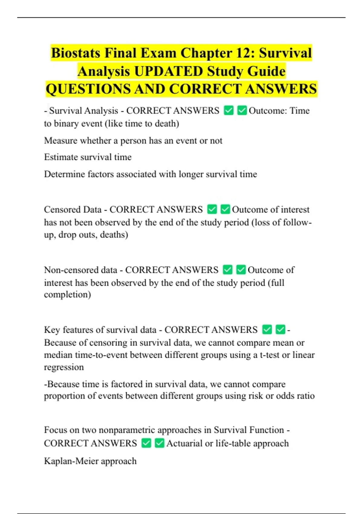 Biostats Final Exam Chapter 12: Survival Analysis UPDATED Study Guide QUESTIONS AND CORRECT ANSWERS - Survival Analysis - CORRECT ANSWERS to binary event (like time to death) Measure whether a person has an event or not Estimate survival time Outc