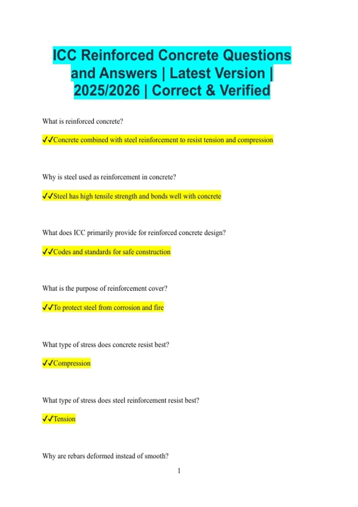 ICC Reinforced Concrete Questions and Answers | Latest Version | 2025/2026 | Correct & Verified What is reinforced concrete? Concrete combined with steel reinforcement to resist tension and compression Why is steel used as reinforcement in concrete? Steel has high tensile strength and bonds well with concrete What does ICC primarily provide for reinforced concrete design? Codes and standards for safe construction What is the purpose of reinforcement cover? To protect steel from corrosion and fire What type of stress does concrete resist best? Compression What type of stress does steel reinforcement resist best? Tension Why are rebars deformed instead of smooth? 2 To improve bond with concrete What is meant by bond strength in reinforced concrete? The grip between concrete and steel Why is curing important in reinforced concrete? To achieve required strength and durability What is the minimum curing period typically required? Seven days for normal conditions What happens if reinforcement cover is too small? Steel may corrode and reduce strength What is the function of stirrups in beams? To resist shear forces What is a reinforced concrete beam mainly designed to resist? Bending moments What is the role of reinforcement in columns? To increase load-carrying capacity 3 What does a slab primarily distribute? Loads over a large area Why are slabs reinforced in two directions? To resist bending in both directions What is meant by effective depth of a beam? Distance from compression face to centroid of tension steel Why is spacing of reinforcement important? To ensure proper load distribution and crack control What causes cracking in reinforced concrete? Tensile stresses exceeding concrete capacity What type of cracks are acceptable in reinforced concrete? Hairline cracks within code limits Why are control joints used in concrete structures? To control cracking due to shrinkage 4 What is shrinkage in concrete? Reduction in volume as concrete dries What is creep in concrete? Long-term deformation under sustained load Why does ICC limit maximum reinforcement ratio? To prevent brittle failure What is a singly reinforced beam? A beam reinforced only
