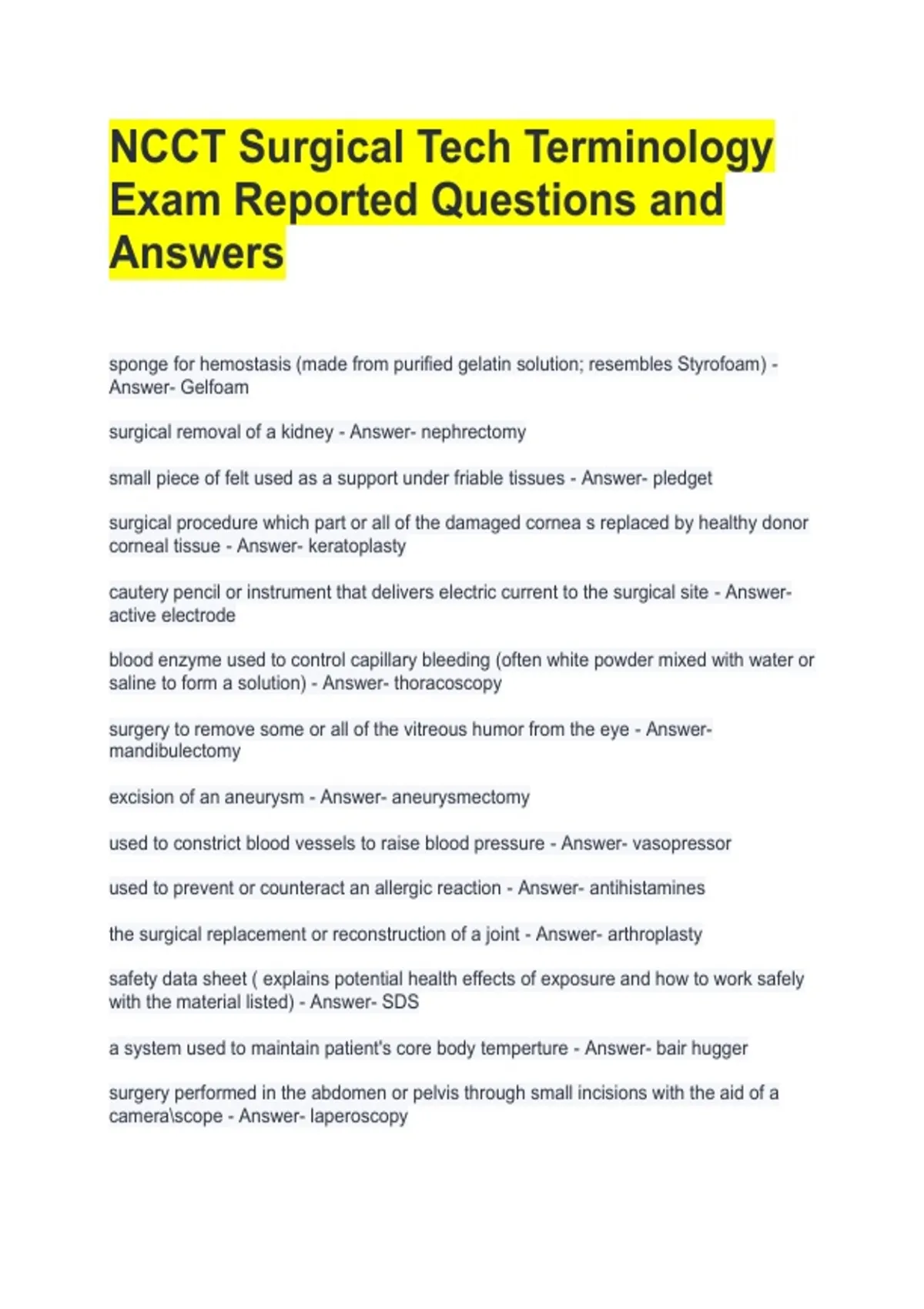 NCCT Surgical Tech Terminology Exam Reported Questions and Answers