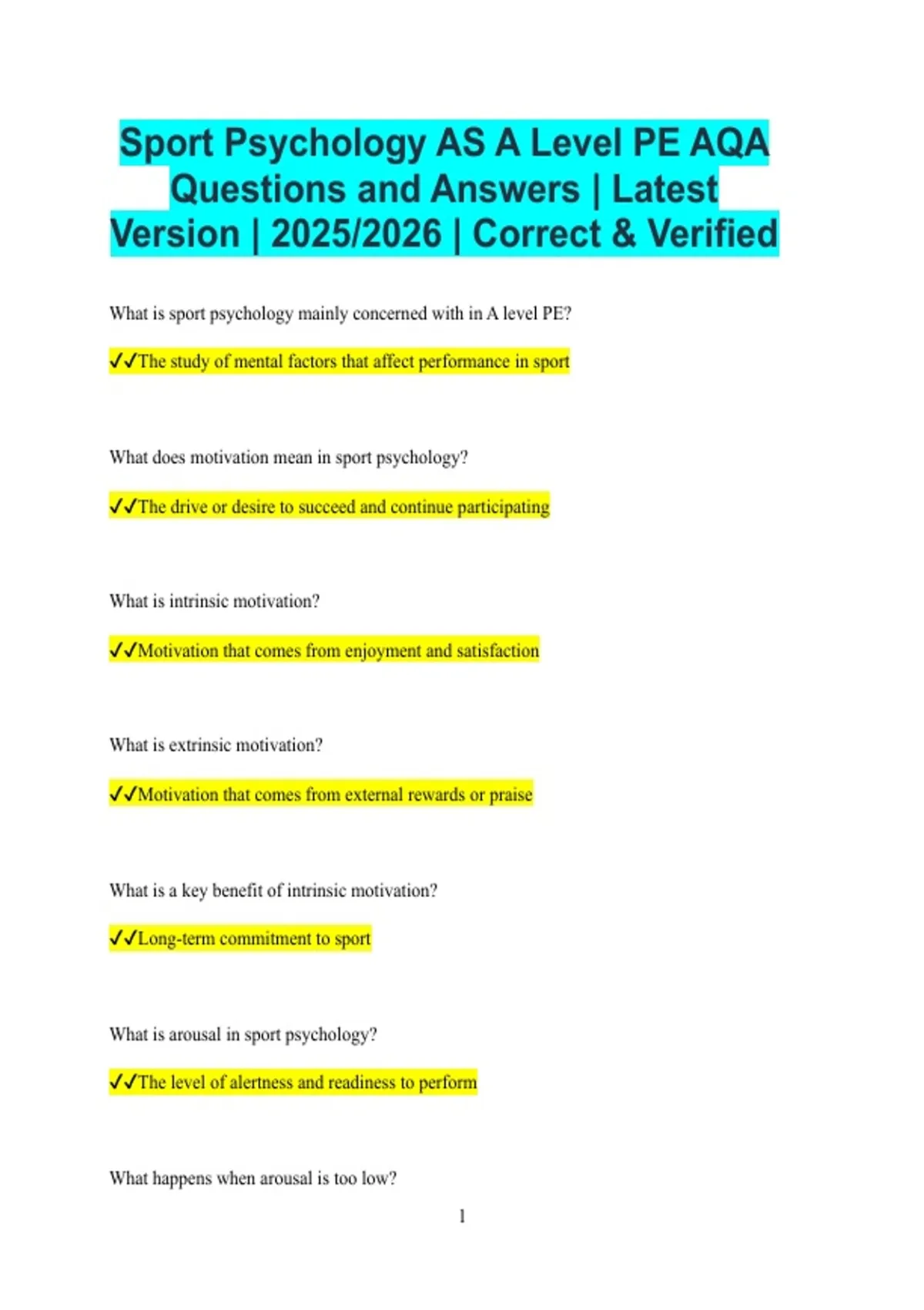 Sport Psychology AS A Level PE AQA Questions and Answers | Latest Version | 2025/2026 | Correct & Verified What is sport psychology mainly concerned with in A level PE? The study of mental factors that affect performance in sport What does motivation mean in sport psychology? The drive or desire to succeed and continue participating What is intrinsic motivation? Motivation that comes from enjoyment and satisfaction What is extrinsic motivation? Motivation that comes from external rewards or praise What is a key benefit of intrinsic motivation? Long-term commitment to sport What is arousal in sport psychology? The level of alertness and readiness to perform What happens when arousal is too low? Performance is often poor due to lack of focus What happens when arousal is too high? Performance may decline due to anxiety What does the inverted-U theory explain? The relationship between arousal and performance What is anxiety in sport? A negative emotional response to stress What is trait anxiety? A stable personality tendency to feel anxious What is state anxiety? Temporary anxiety felt in specific situations What is cognitive anxiety? Mental worry and negative thoughts What is somatic anxiety? Physical symptoms such as sweating or increased heart rate What is aggression in sport? Intentional behaviour aimed at harming another What is assertive behaviour? Forceful play within the rules without intent to harm What is hostile aggression? Aggression intended to cause harm What is instrumental aggression? Aggression used as a means to achieve a goal What is drive theory? The idea that increased arousal increases performance Why is drive theory limited? It does not explain poor performance at high arousal What is personality in sport psychology? A set of stable characteristics influencing behaviour