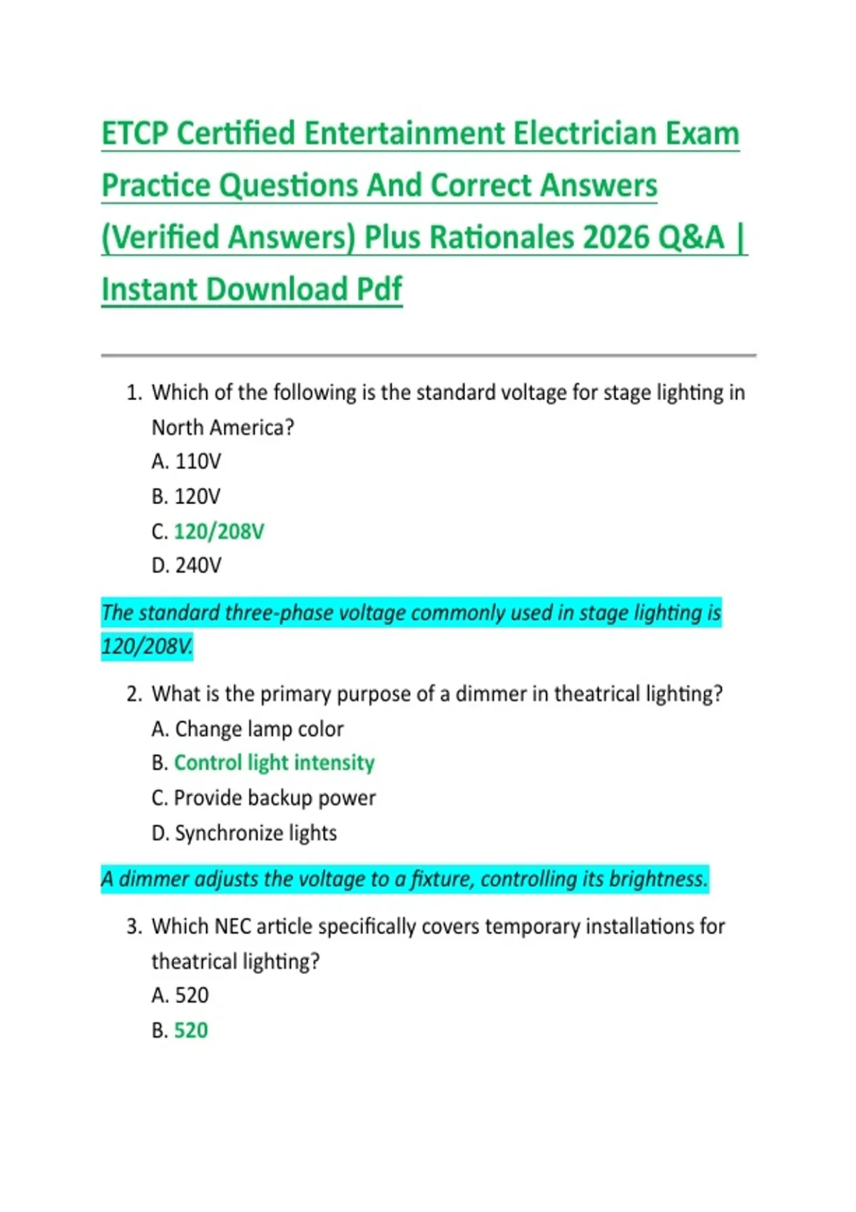 ETCP Certified Entertainment Electrician Exam Practice Questions And Correct Answers (Verified Answers) Plus Rationales 2026 Q&A | Instant Download Pdf
