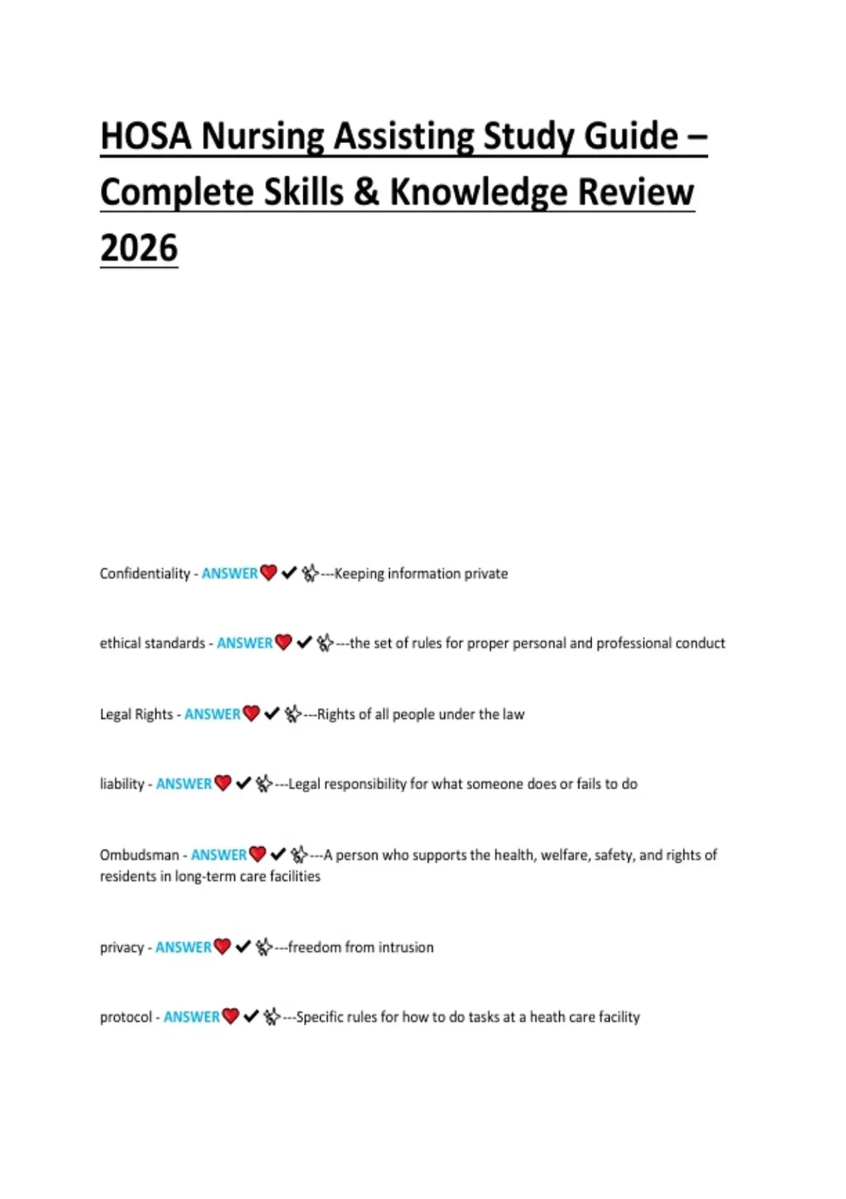 Comprehensive 2026 HOSA Nursing Assisting study guide covering essential nursing assistant skills and knowledge. Includes patient care techniques, vital signs, infection control, clinical procedures, communication, and professional behavior. Features practice exercises, scenarios, and tips to help students excel in HOSA competitions and clinical assessments