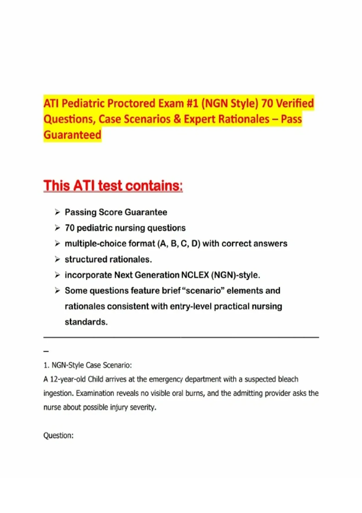 ATI Pediatric Proctored Exam #1 (NGN Style) 70 Verified Questions, Case Scenarios & Expert Rationales – Pass GuaranteedPrepare with confidence for your ATI Pediatric Proctored Exam 1 using this Next Generation NCLEX (NGN) style resource, designed to mirror the actual exam format and guarantee success. This prep set includes 70 verified multiple‑choice questions (MCQs), case scenarios, and expert‑verified rationales to ensure you’re ready to pass on the first attempt. Features: - 70 Actual Pediatric Questions & Answers with structured rationales - 100% Pass Guarantee for exam readiness - NGN‑Style Case Scenarios integrated into the question set - Expert‑Verified Rationales explaining correct and incorrect answers - Evidence‑Based Content aligned with ATI and NCLEX standards - Accessible Format for flexible study anytime, anywhere Sample Topics Covered: - Renal & Fluid Balance: Glomerulonephritis dietary modifications, hemolytic uremic syndrome labs - Neurological Disorders: Seizure safety teaching, tonic‑clonic seizure interventions - Endocrine & Metabolic: Type 1 diabetes HbA1c priority findings, PKU dietary management - Immunizations: Anticipatory guidance for infant vaccine schedules (IPV, MMR, Varicella, HepA) - Hematology: Sickle cell crisis interventions (warm compresses, hydration) - Respiratory: RSV tachypnea as a priority finding, pneumonia distress signs - Nutrition: Lactose intolerance dietary teaching, nondairy calcium sources - Growth & Development: Appropriate play activities, developmental milestones, SIDS prevention strategie