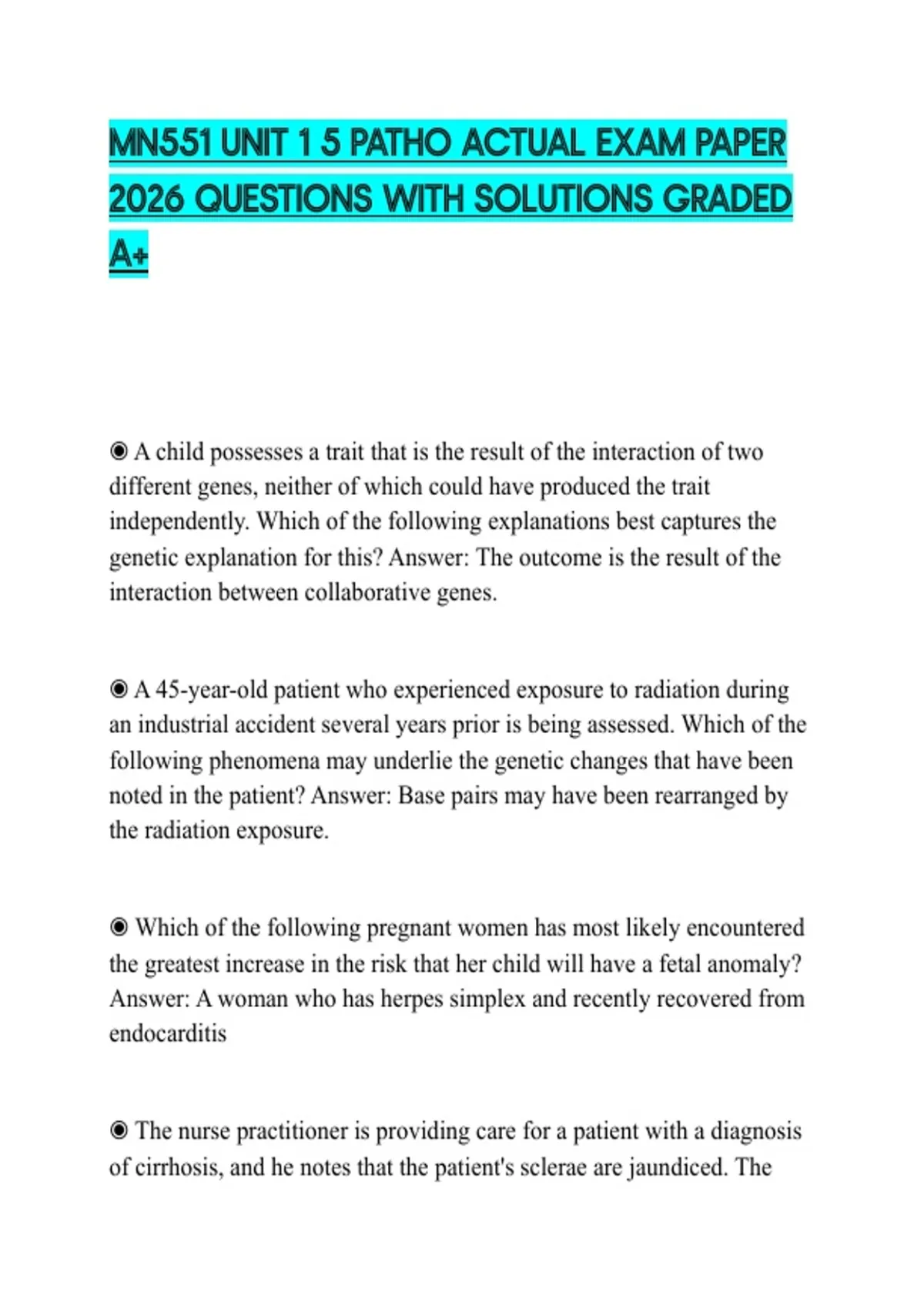 MN551 UNIT 1 5 PATHO ACTUAL EXAM PAPER 2026 QUESTIONS WITH SOLUTIONS GRADED A+