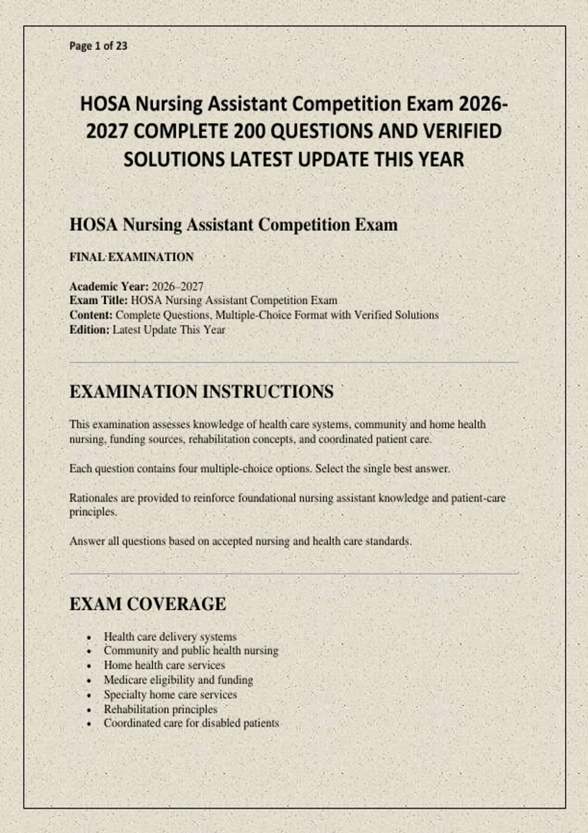 Tap on AVAILABLE IN BUNDLE / PACKAGE DEAL to unlock free bonus exams — save more while getting everything you need! You’ll be glad you did! The HOSA Nursing Assistant Competition Exam 2026–2027 provides a fully updated and comprehensive study resource designed to help candidates excel in the nursing assistant competition examination. This in-depth guide covers key topics, including patient care principles, infection control, vital signs, medical terminology, safety protocols, communication skills, ethical practice, and scenario-based problem-solving. The complete set of 200 questions includes verified solutions to reinforce understanding, enhance retention, and build confidence for exam day. Ideal for nursing students, healthcare assistants, and HOSA competitors preparing for the Nursing Assistant Competition Exam, this resource ensures thorough review, practical practice, and reliable exam readiness.