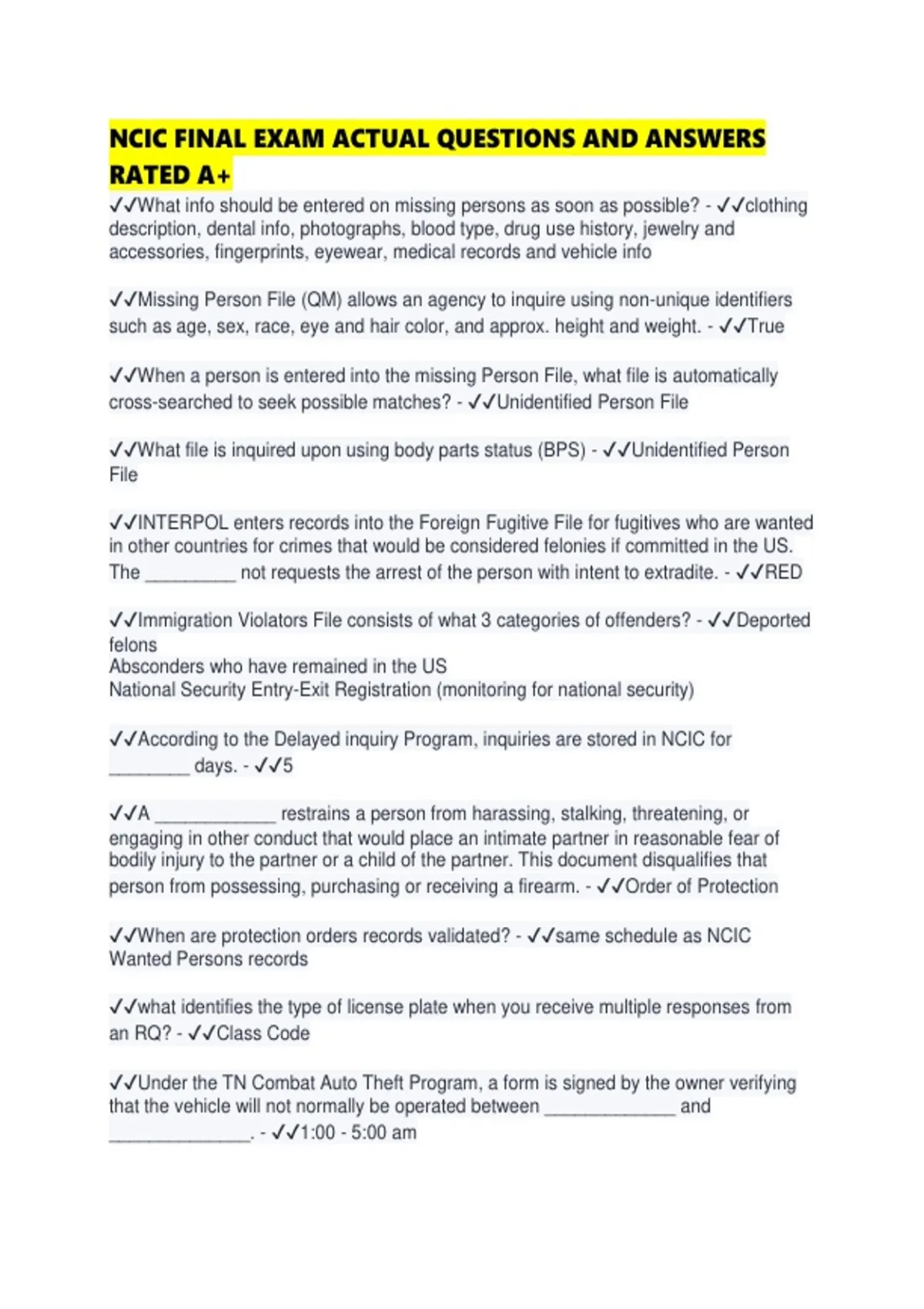 NCIC FINAL EXAM ACTUAL QUESTIONS AND ANSWERS RATED A+