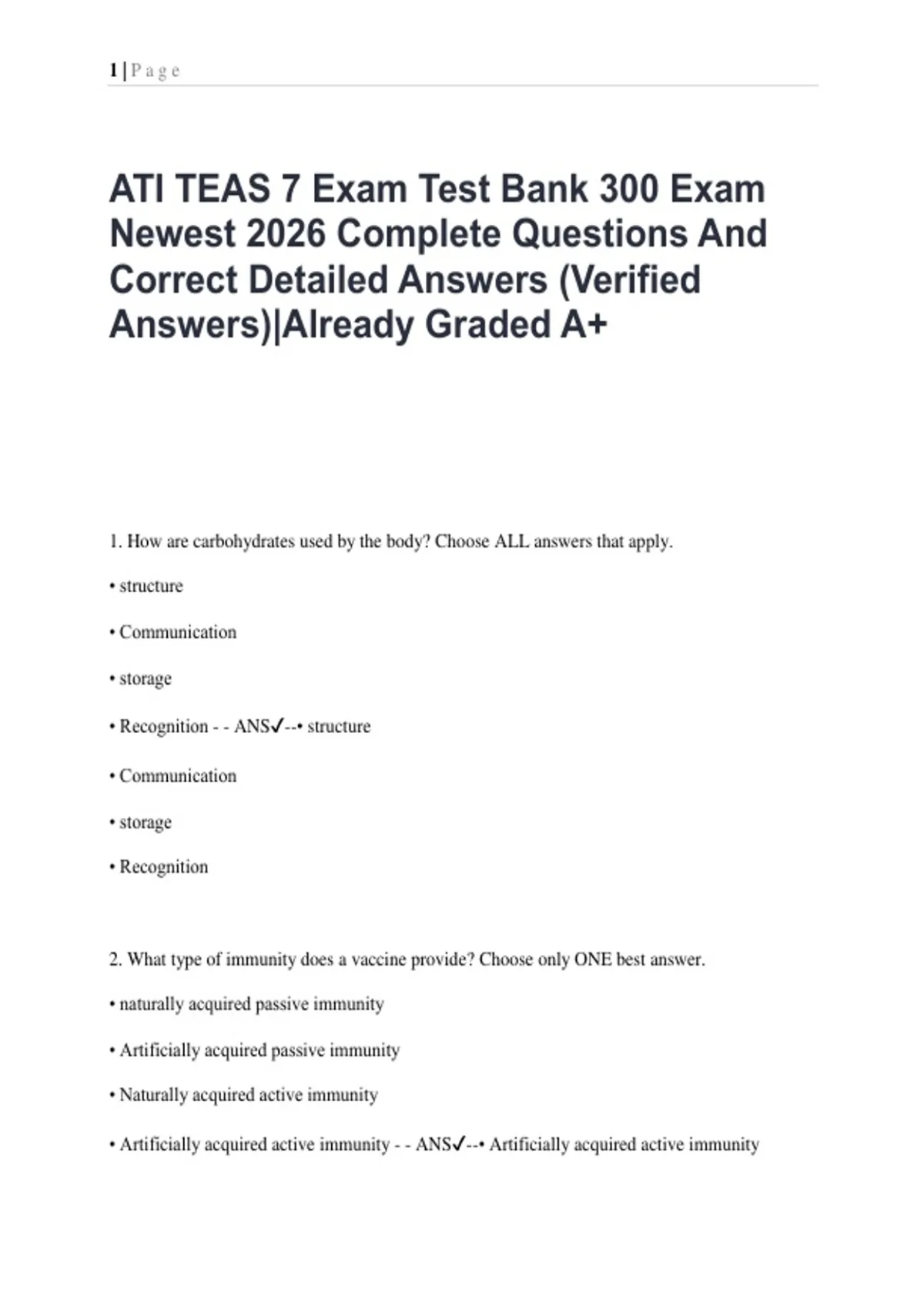ATI TEAS 7 Exam Test Bank 300 Exam Newest 2026 Complete Questions And Correct Detailed Answers (Verified Answers)|Already Graded A+
