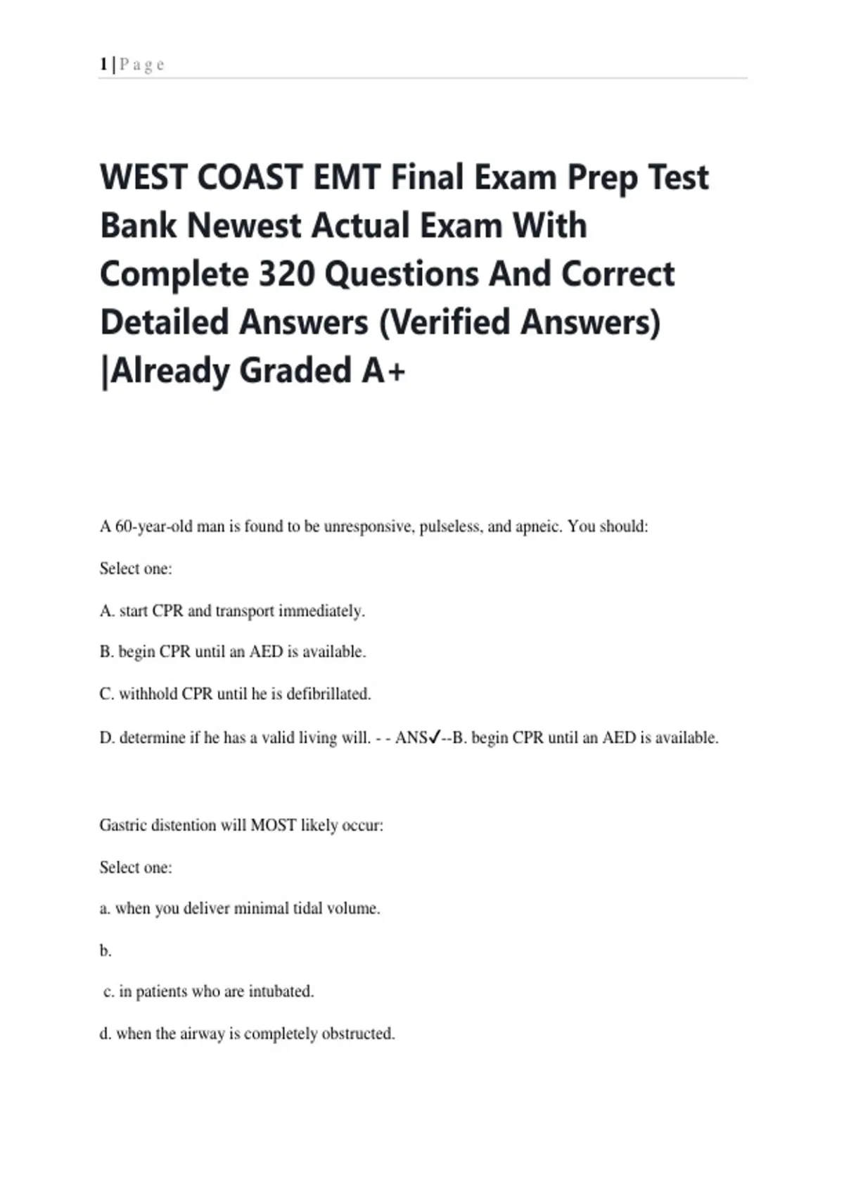 WEST COAST EMT Final Exam Prep Test Bank Newest Actual Exam With Complete 320 Questions And Correct Detailed Answers (Verified Answers) |Already Graded A+