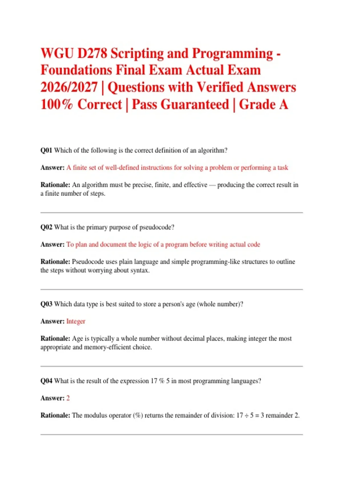 This document contains real WGU D278 Scripting and Programming – Foundations final exam questions for the 2026/2027 assessment cycle, with verified answers that are 100% correct. It covers core programming fundamentals tested on the actual exam, including variables, data types, control structures, functions, basic algorithms, and problem-solving logic. The material mirrors real exam-style questions to support accurate preparation and confident performance.