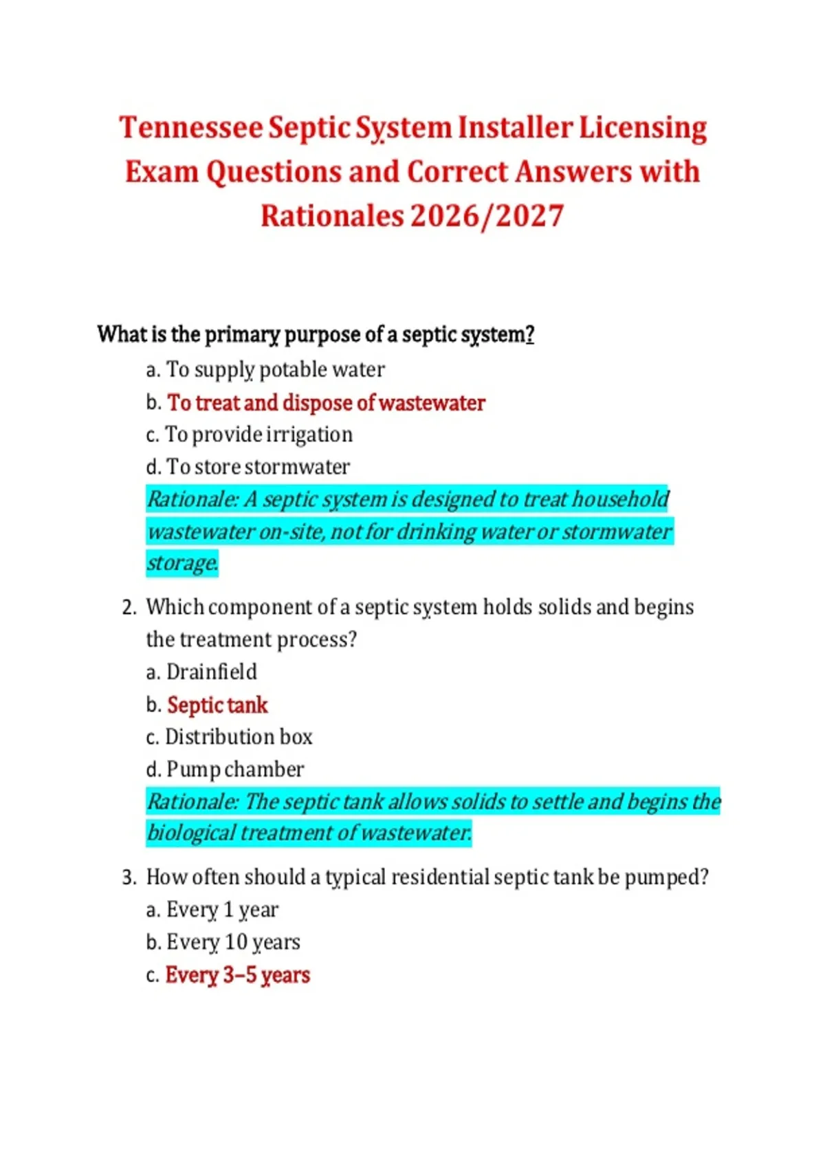This document provides a comprehensive set of practice exam questions for the Tennessee Septic System Installer Licensing Exam, including correct answers and clear rationales. It covers key topics such as septic system components, soil evaluation, permitting requirements, setbacks, installation standards, and common system failures, aligned with current Tennessee regulations for the 2026/2027 exam cycle. The material is suitable for exam preparation and review for both first-time test takers and installers seeking license renewal.