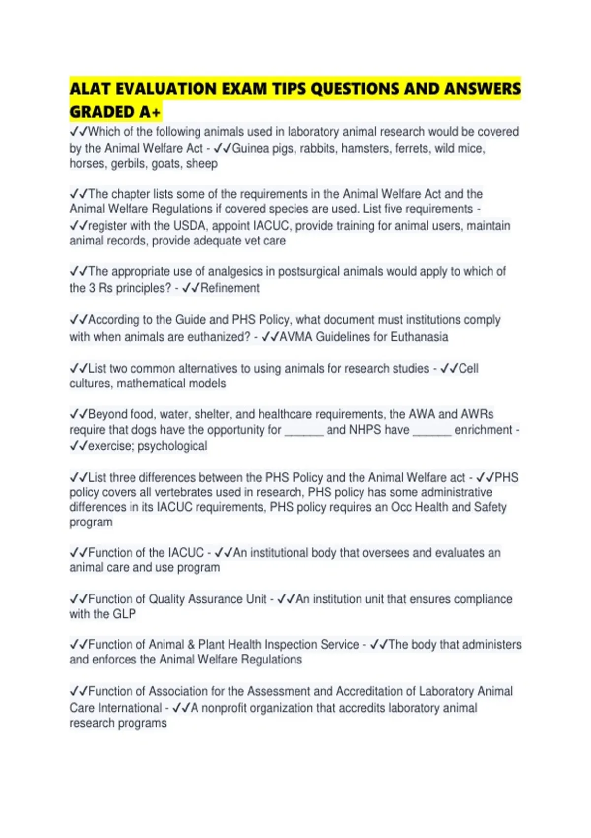 ✔✔List three differences between the PHS Policy and the Animal Welfare act - ✔✔PHS