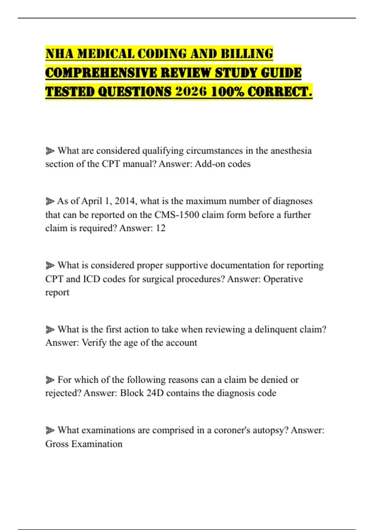 NHA MEDICAL CODING AND BILLING COMPREHENSIVE REVIEW STUDY GUIDE TESTED QUESTIONS 2026 100% CORRECT.
