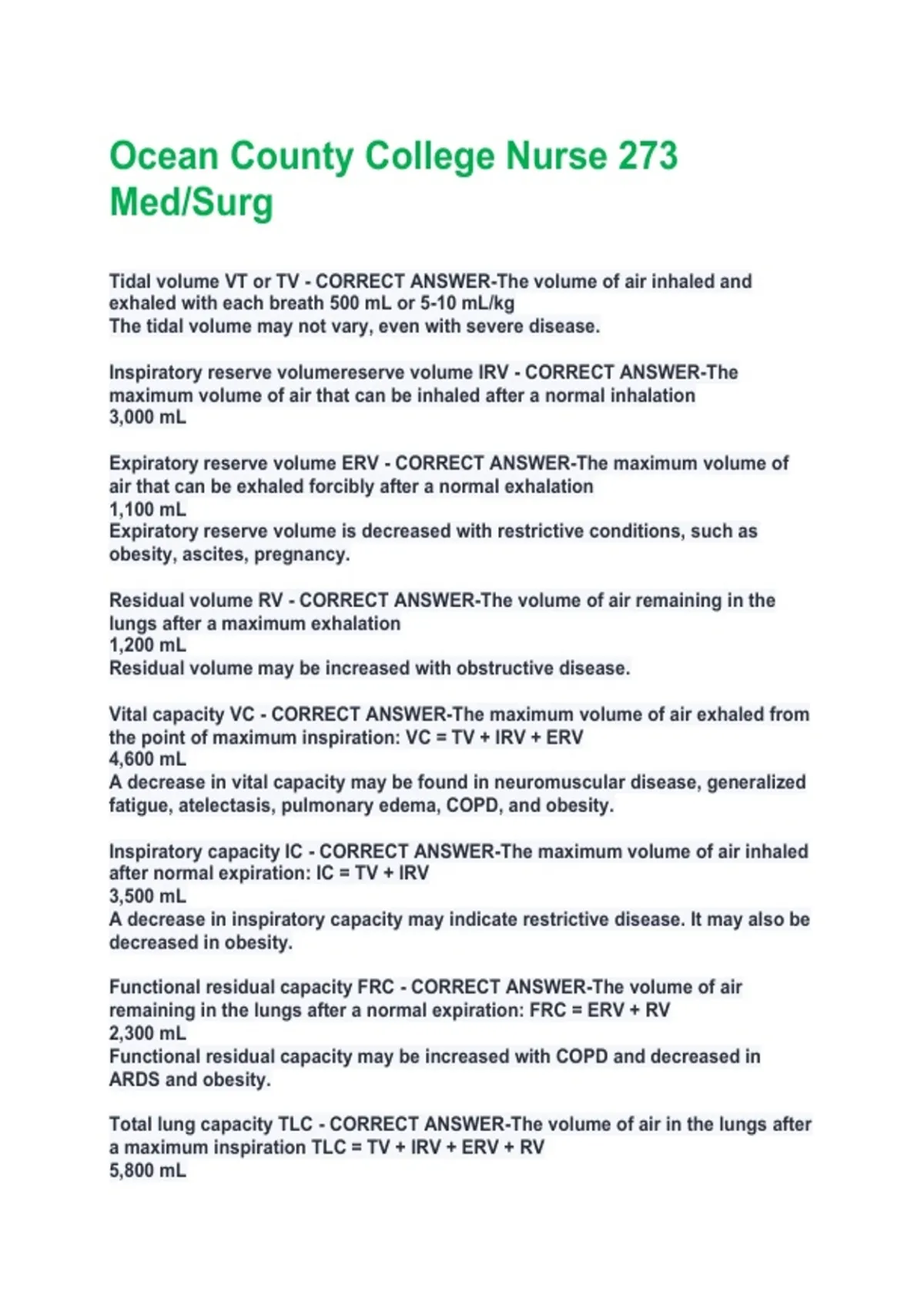 Total lung capacity TLC - CORRECT ANSWER-The volume of air in the lungs after