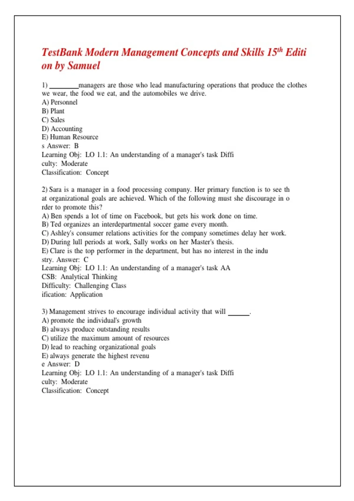Ace your management course with the official Test Bank for Modern Management Concepts and Skills, 15th Edition by Samuel. This essential study resource is packed with practice questions, detailed answers, and learning objectives aligned with each chapter of the textbook—helping you master key concepts, prepare for exams, and boost your confidence. What’s Inside: Chapter-by-Chapter Practice – Hundreds of multiple-choice, true/false, and application questions covering all critical topics. Detailed Explanations – Every answer includes clear reasoning and references to learning objectives. Real-World Application – Scenarios and case-based questions to help you apply management theories in practical settings. Exam-Ready Material – Questions are categorized by difficulty (Easy, Moderate, Challenging) to match test formats. Key Topics Covered: Management Fundamentals – Roles, functions, and skills of managers Entrepreneurship – Opportunity identification, evaluation, and exploitation Social Responsibility & Ethics – Corporate citizenship, sustainability, and ethical decision-making Diversity & Inclusion – Managing diverse teams and promoting equity in organizations Global Management – International strategies, cross-cultural challenges, and multinational operations Creativity & Innovation – Fostering innovation, TQM, and the innovation process Whether you’re reviewing for midterms, finals, or assignments, this Test Bank is your secret weapon for higher grades and deeper understanding. Don’t just study—practice with purpose and excel in your management course. Perfect for students, instructors, and self-learners. Get your copy today and take the first step toward academic success!