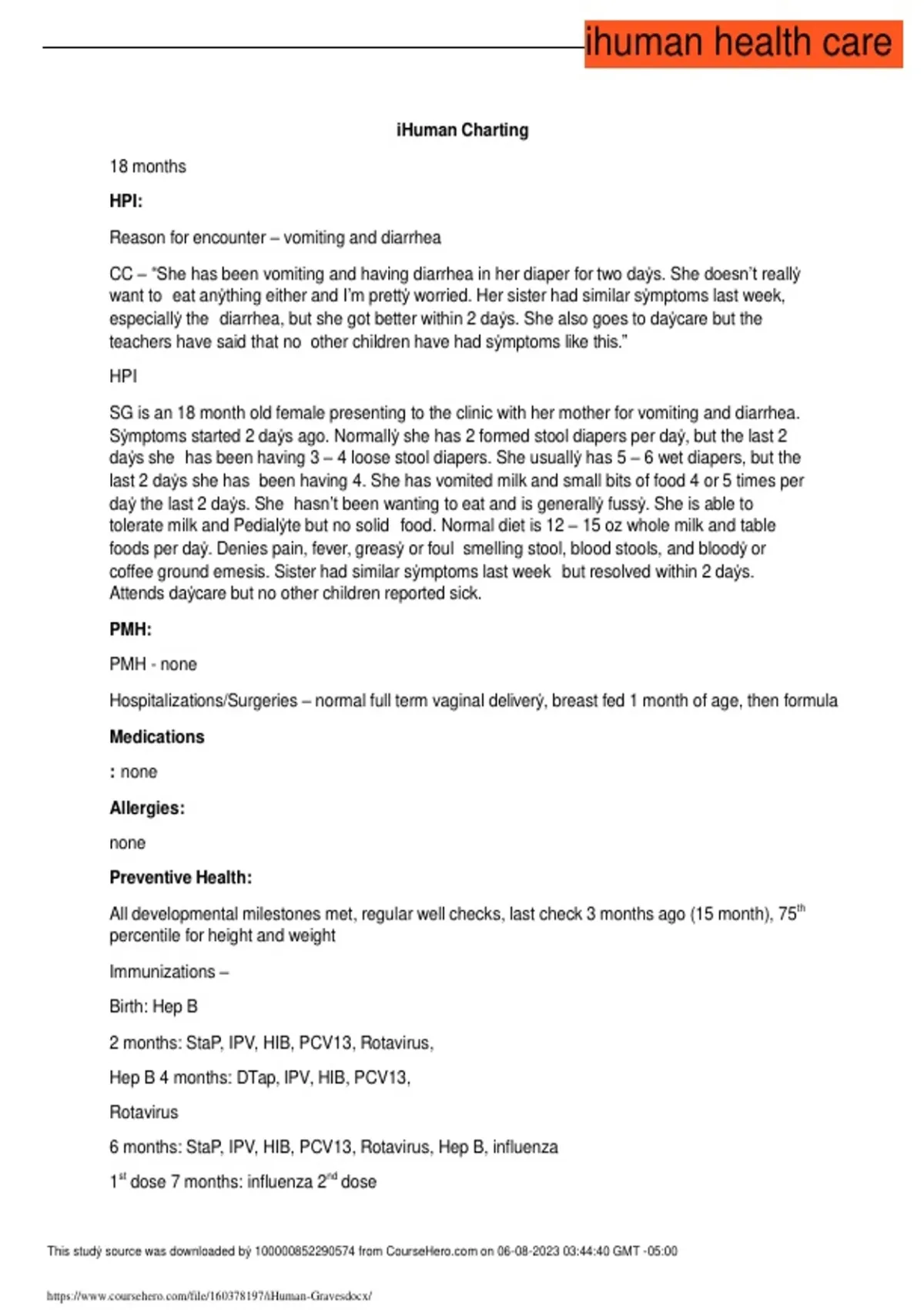 SG is an 18 month old female presenting to the clinic with her mother for vomiting and diarrhea.