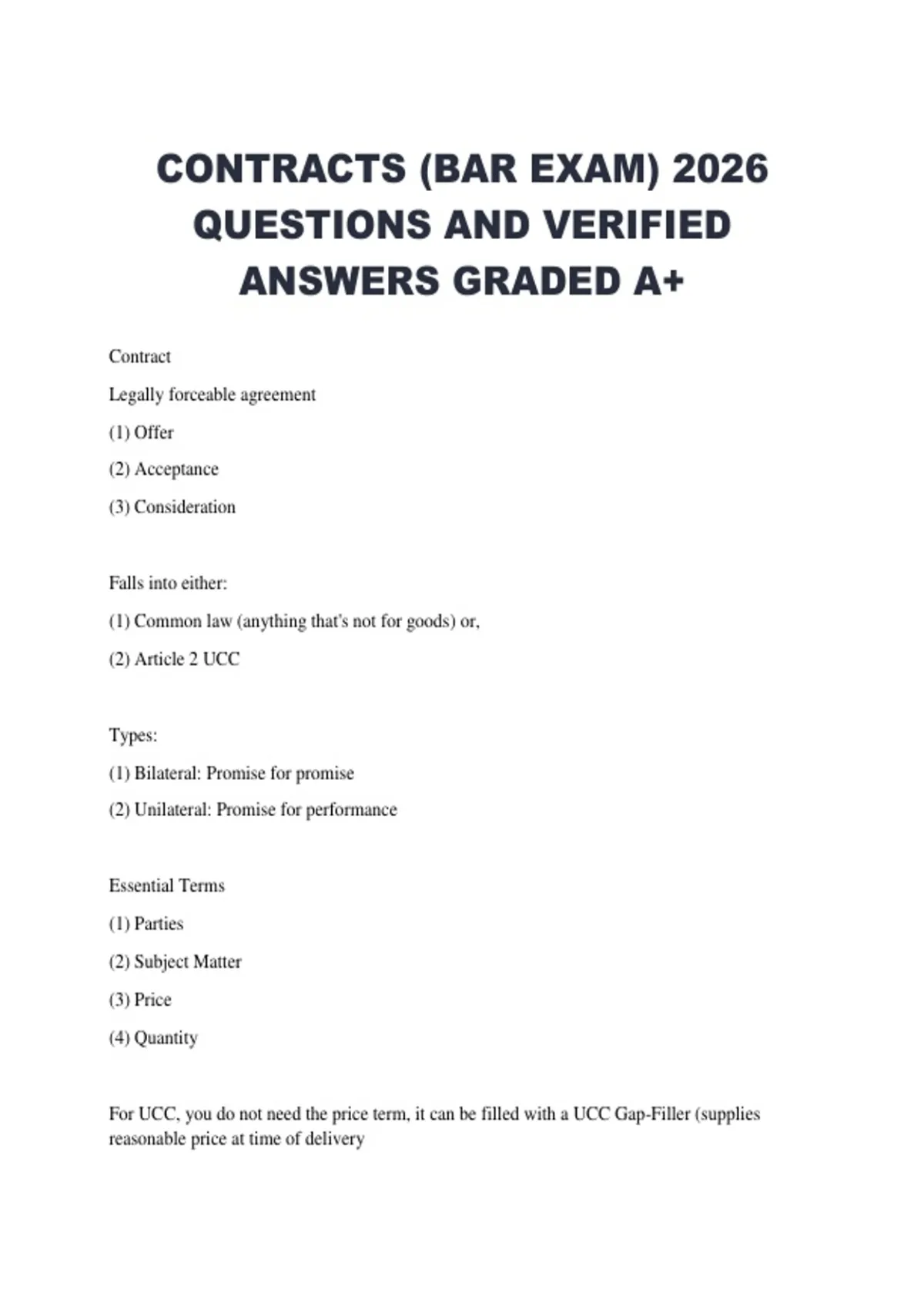 CONTRACTS (BAR EXAM) 2026 QUESTIONS AND VERIFIED ANSWERS GRADED A+ CONTRACTS (BAR EXAM) 2026 CONTRACTS (BAR EXAM) 2026 QUESTIONS AND VERIFIED ANSWERS