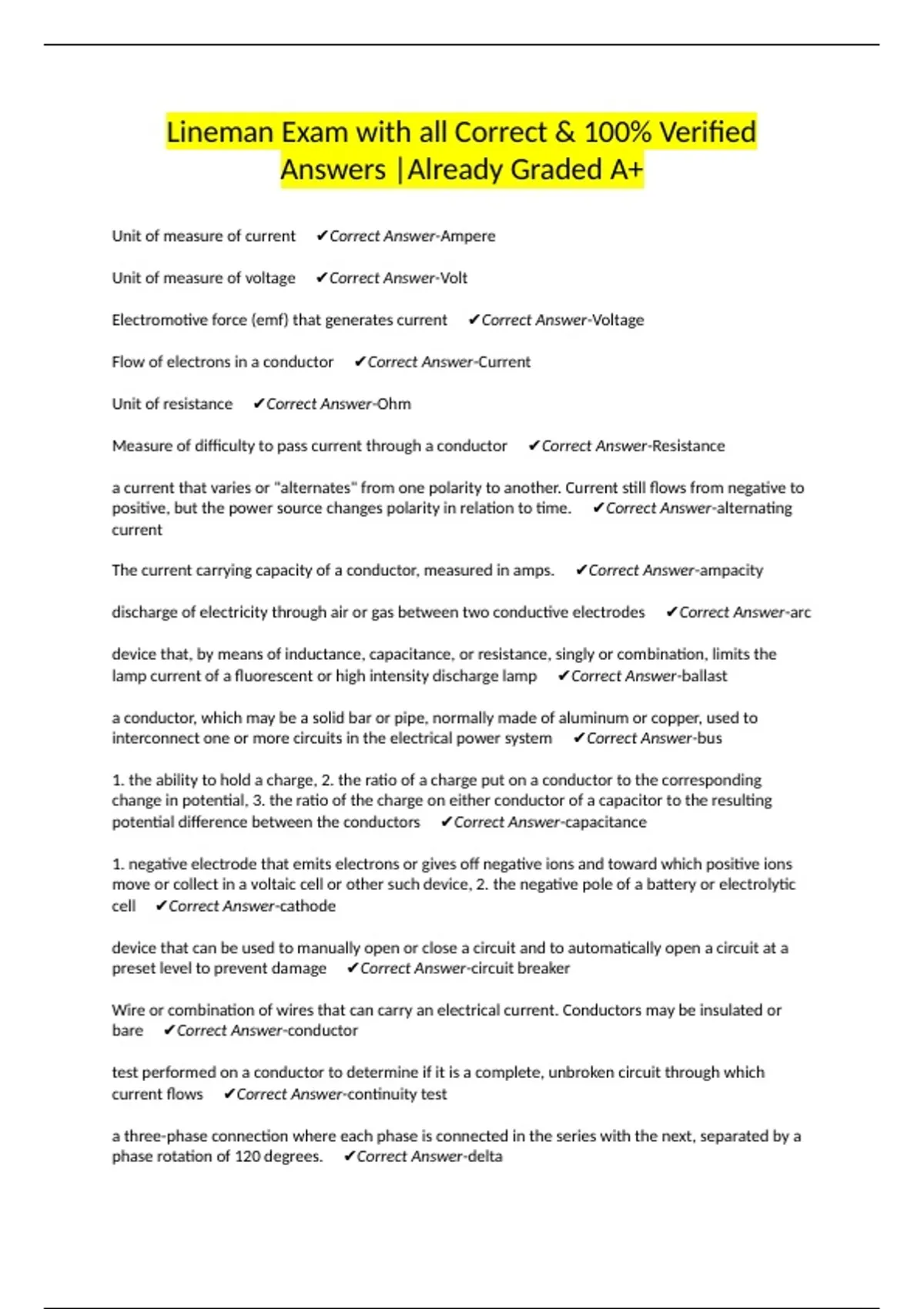 Lineman Exam with all Correct & 100% Verified Answers |Already Graded A+