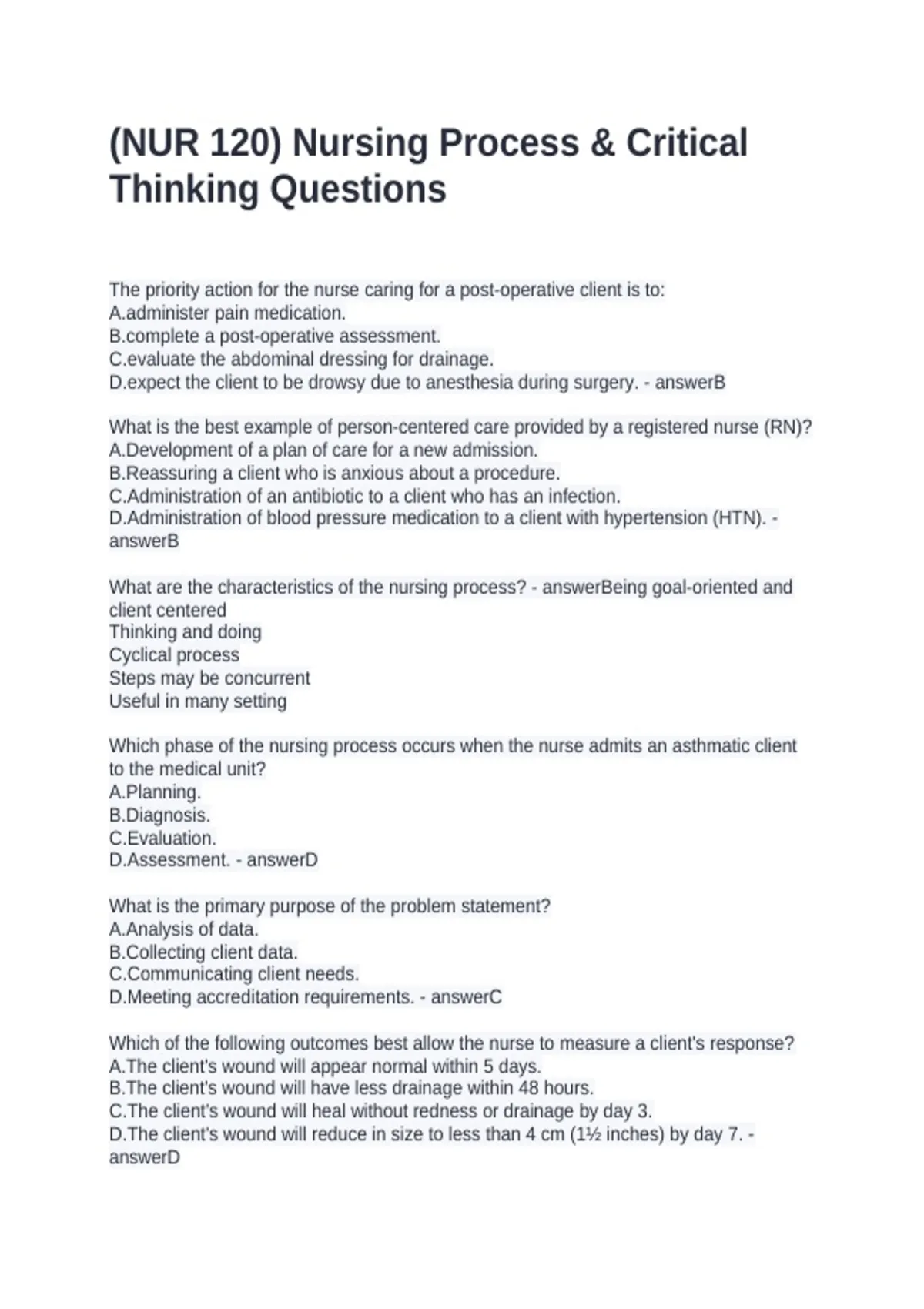 (NUR 120) Nursing Process & Critical Thinking Questions - 100% Correct