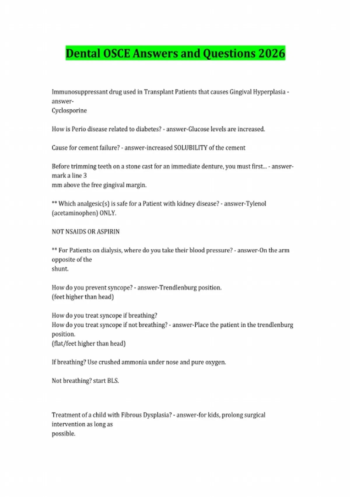 Dental OSCE Answers and Questions 2026 Immunosuppressant drug used in Transplant Patients that causes Gingival Hyperplasia - answer- Cyclosporine How is Perio disease related to diabetes? - answer-Glucose levels are increased. Cause for cement failure? - answer-increased SOLUBILITY of the cement Before trimming teeth on a stone cast for an immediate denture, you must first... - answer mark a line 3 mm above the free gingival margin. ** Which analgesic(s) is safe for a Patient with kidney disease? - answer-Tylenol (acetaminophen) ONLY. NOT NSAIDS OR ASPIRIN ** For Patients on dialysis, where do you take their blood pressure? - answer-On the arm opposite of the shunt. How do you prevent syncope? - answer-Trendlenburg position. (feet higher than head) How do you treat syncope if breathing? How do you treat syncope if not breathing? - answer-Place the patient in the trendlenburg position. (flat/feet higher than head) If breathing? Use crushed ammonia under nose and pure oxygen. Not breathing? start BLS. Treatment of a child with Fibrous Dysplasia? - answer-for kids, prolong surgical intervention as long as