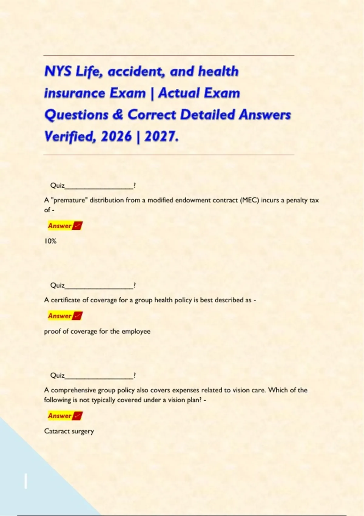 NYS Life, accident, and health insurance Exam | Actual Exam Questions & Correct Detailed Answers Verified, 2026 | 2027. Quiz_________________? A "premature" distribution from a modified endowment contract (MEC) incurs a penalty tax of - Answer 10% Quiz_________________? A certificate of coverage for a group health policy is best described as - Answer proof of coverage for the employee Quiz_________________? A comprehensive group policy also covers expenses related to vision care. Which of the following is not typically covered under a vision plan? - Answer Cataract surgery Quiz_________________? A comprehensive major medical health insurance policy contains an Eligible Expenses provision which identifies the types of health care services that are covered. All of the following health care services are typically covered EXCEPT for - Answer Experimental and investigative services Quiz_________________? A copy of all Medicare Supplement advertisements must be submitted for approval to - Answer The Superintendent of Insurance Quiz_________________? A disability income insurance policy was recently issued with a rating. What does this mean? - Answer Policyowner will be charged an additional premium Quiz_________________? A family counseling benefit is typically offered under which of these coverages? - Answer Hospice care Quiz_________________? A group health insurance policy is a contract between an - Answer Employer and insurance company Quiz_________________? A group-owned insurance company that is formed to assume and spread the liability risks of its members is known as a - Answer Risk retention group Quiz_________________? A health insurer MUST provide a proof of loss form - Answer within 15 days of receipt of the notice of loss Quiz_________________? A health plan offered by private insurance companies is - Answer A Medicare Supplement Quiz_________________? A Health Reimbursement Arrangement MUST be established - Answer By the employer Quiz_________________? A large corporation pension plan purchased an accumulation annuity contract where all of the participating employees received certificates of participation. What is this contract called? - Answer Group deferred annuity Quiz_________________? A life insurance guaranteed insurability rider gives the insured the right, without proving insurability, to - Answer Periodically purchase additional insurance Quiz_________________? A life insurance illustration showing future premiums being paid out of nonguaranteed values must disclose that - Answer The policy owner may need to resume premium payments depending on actual results Quiz_________________? A life insurance policy provision that has the ability to reduce the death benefit is called the - Answer accelerated (living) benefit Quiz_________________? A life insurance policy that includes a return of premium rider will pay the beneficiary how much upon the insured's death? - Answer Total premiums paid plus the policy face amount Quiz_________________? A life insurance producer licensed in New York is authorized to - Answer Solicit, receive and forward applications to the insurer Quiz_________________? A life insurance producer's underwriting duties may include - Answer seeking additional information requested by the insurance company