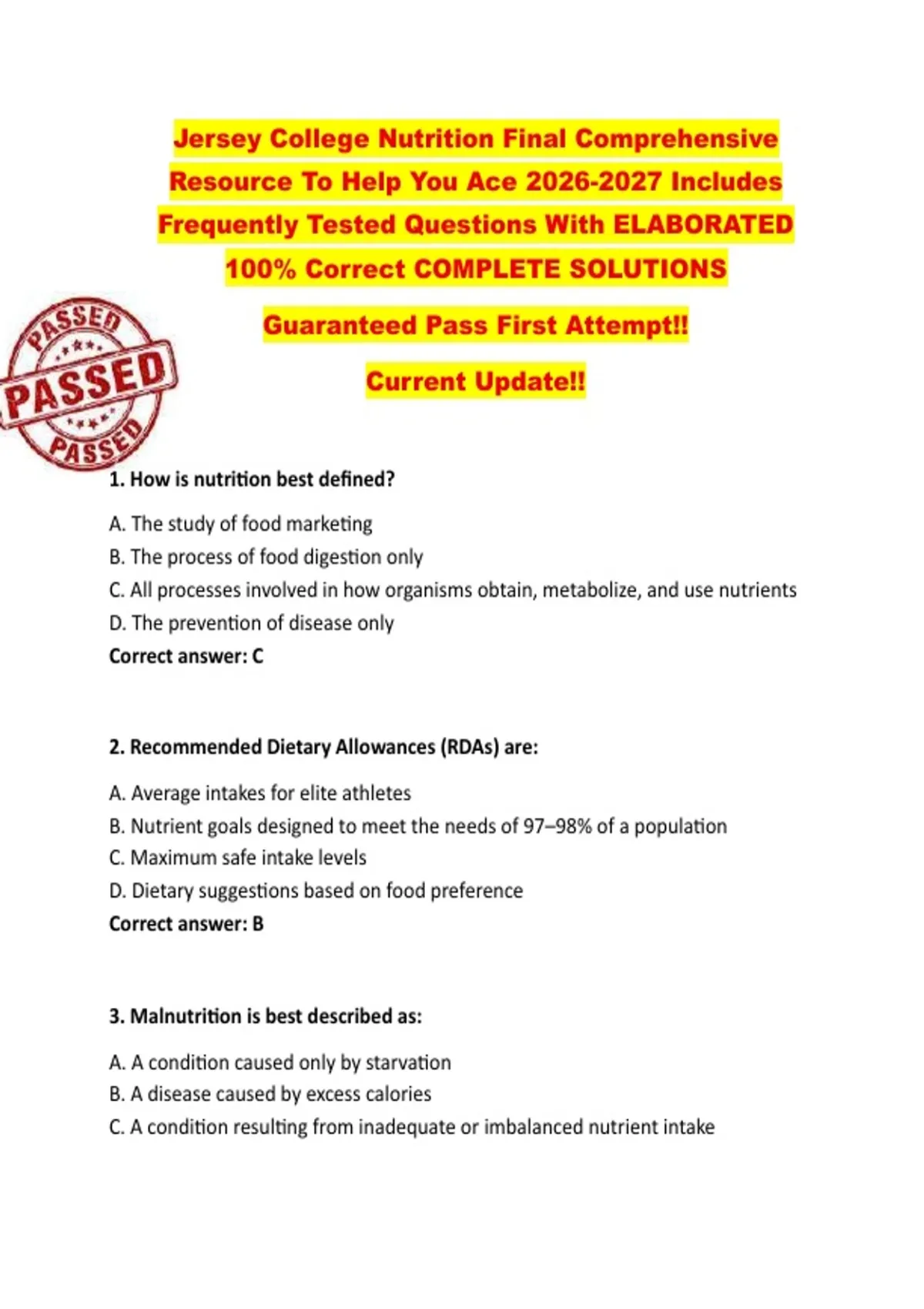Jersey College Nutrition Final Comprehensive Resource To Help You Ace Includes Frequently Tested Questions With ELABORATED 100% Correct COMPLETE SOLUTIONS Guaranteed Pass First Attempt!! Current Update!! 1. How is nutrition best defined? A. The study of food marketing B. The process of food digestion only C. All processes involved in how organisms obtain, metabolize, and use nutrients D. The prevention of disease only Correct answer: C 2. Recommended Dietary Allowances (RDAs) are: A. Average intakes for elite athletes B. Nutrient goals designed to meet the needs of 97–98% of a population C. Maximum safe intake levels D. Dietary suggestions based on food preference Correct answer: B 3. Malnutrition is best described as: A. A condition caused only by starvation B. A disease caused by excess calories C. A condition resulting from inadequate or imbalanced nutrient intake D. A genetic disorder Correct answer: C 4. Lipids are: A. Water-soluble compounds B. Proteins used for energy C. Organic compounds insoluble in water, including triglycerides, phospholipids, and sterols D. Simple sugars Correct answer: C 5. A food desert refers to: A. An area with no food production B. A place with too many grocery stores C. An area lacking access to affordable, nutritious food D. A farming region with drought Correct answer: C 6. A food swamp is best described as: A. An agricultural wetland B. An area dominated by fast food and unhealthy food options C. A location without restaurants D. A rural farming community Correct answer: B 7. Nutrigenomics studies: A. How food is digested B. How genes affect disease only C. How nutrients affect gene expression and vice versa D. How nutrients are absorbed in the gut Correct answer: C 8. Epidemiological studies focus on: A. Laboratory experiments only B. Individual patient treatment C. Patterns, distribution, and frequency of health events in populations D. Genetic testing Correct answer: C