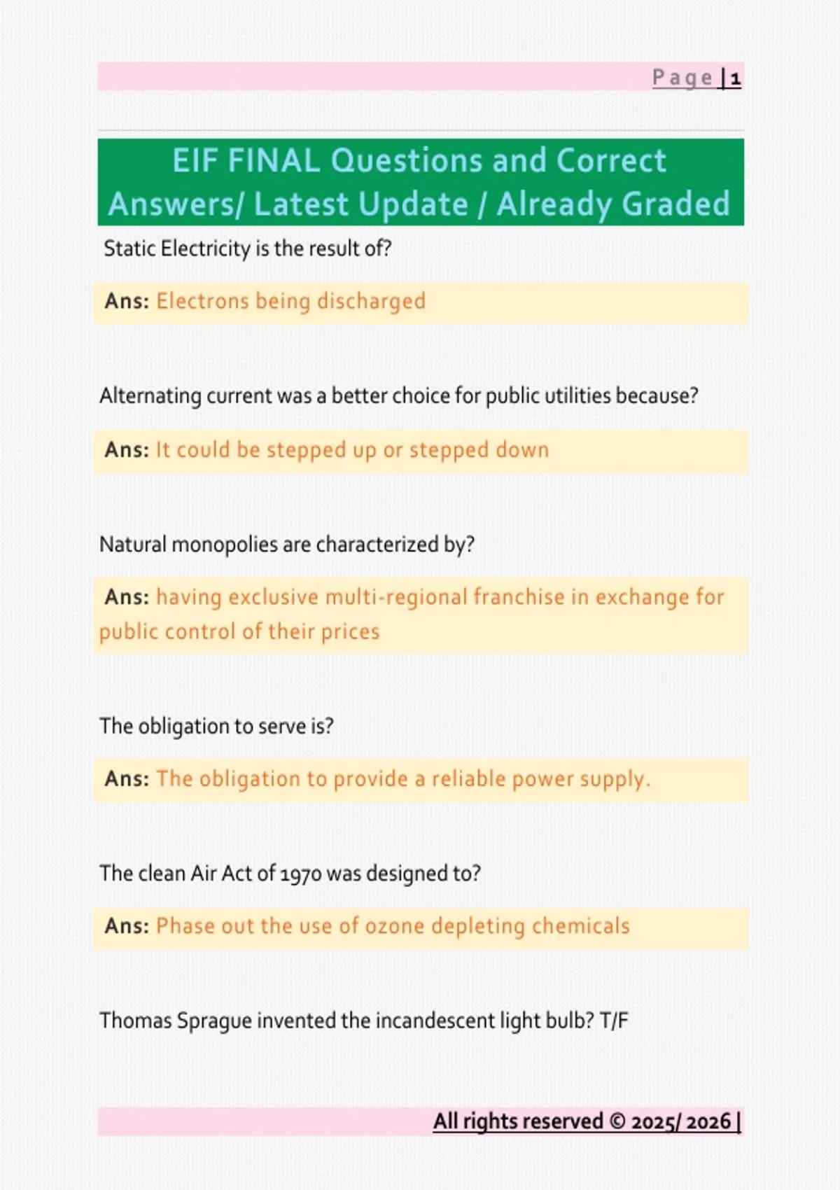 Static Electricity is the result of? Ans: Electrons being discharged Alternating current was a better choice for public utilities because? Ans: It could be stepped up or stepped down Natural monopolies are characterized by? Ans: having exclusive multi-regional franchise in exchange for public control of their prices The obligation to serve is? Ans: The obligation to provide a reliable power supply. The clean Air Act of 1970 was designed to? Ans: Phase out the use of ozone depleting chemicals Thomas Sprague invented the incandescent light bulb? T/F All rights reserved © 2025/ 2026 | Page | 2 Ans: False