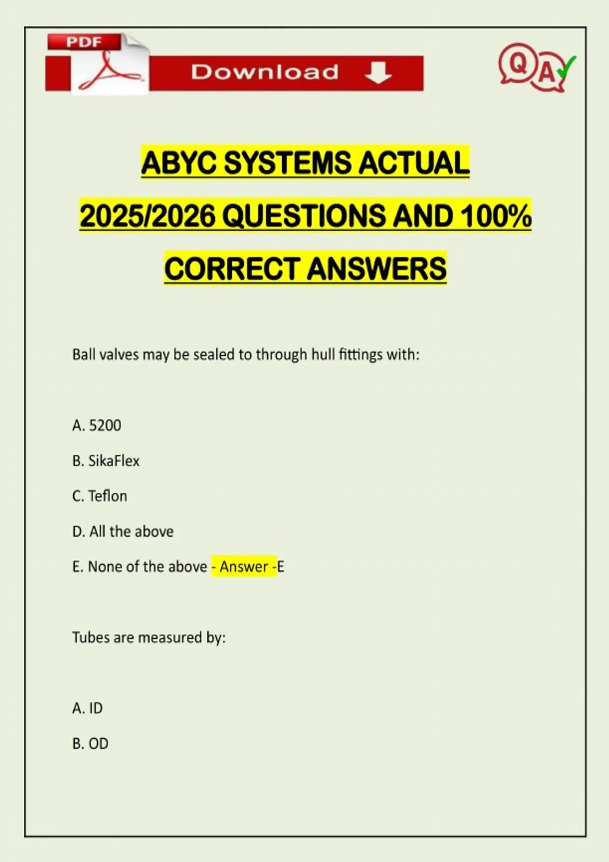 ABYC SYSTEMS ACTUAL 2025/2026 QUESTIONS AND 100% CORRECT ANSWERS Ball valves may be sealed to through hull fittings with: A. 5200 B. SikaFlex C. Teflon D. All the above E. None of the above - Answer -E Tubes are measured by: A. ID B. ODNeed assistance on Online classes, Exams & Assignments? Reach out for instant help!! Full Course Assistance, Plagiarism-free Essay Writing, Research Paper, Dissertation, Discussion Posts, etc…. Confidential & Secure services. Tutors are available for all subjects! Email now at: C. nominal size - Answer -B pipes may not be connected by: A. Welding B. Threaded fittings C. Compression fittings D. Glue - Answer -C Tech A says Seacocks must be readily accessible. Tech B say its ok to have them within 12" of the engine. who is corr