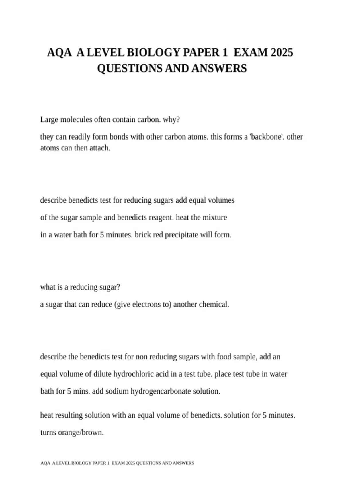 AQA A LEVEL BIOLOGY PAPER 1 EXAM 2025 QUESTIONS AND ANSWERS