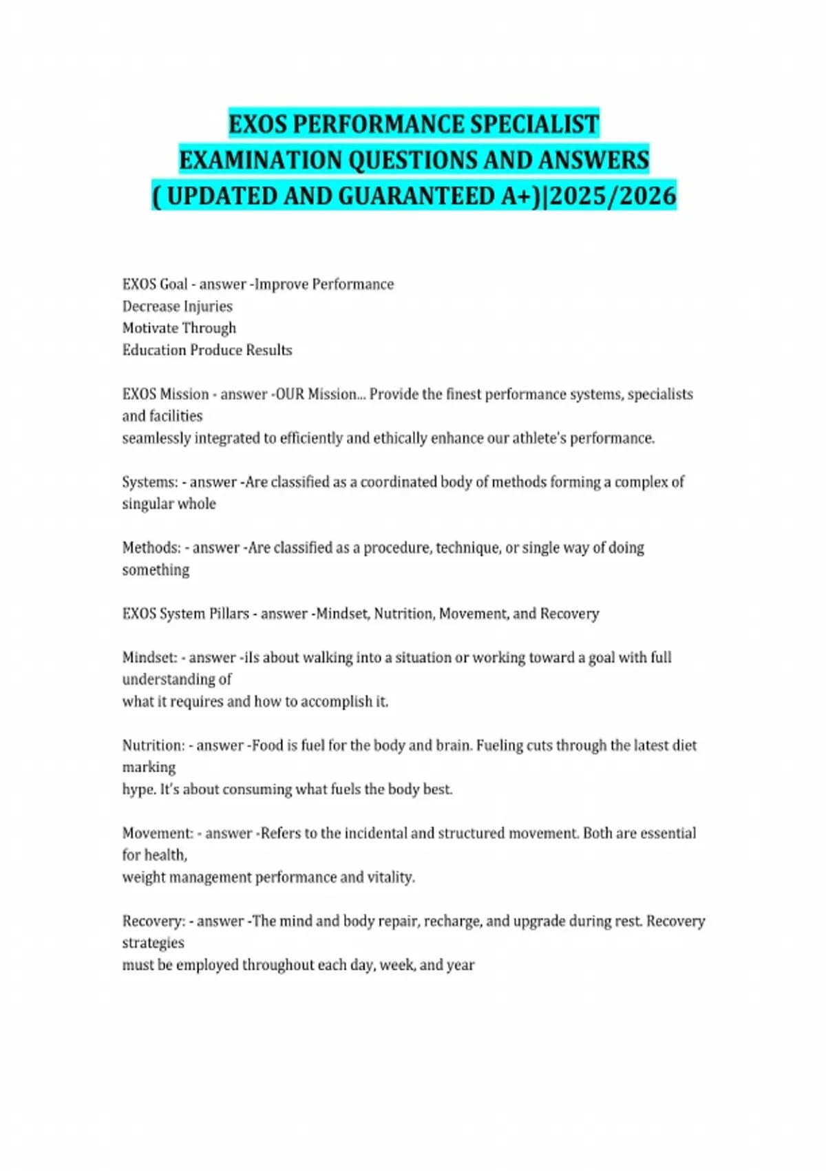 EXOS PERFORMANCE SPECIALIST EXAMINATION QUESTIONS AND ANSWERS ( UPDATED AND GUARANTEED A+)|2025/2026 EXOS Goal - answer -Improve Performance Decrease Injuries Motivate Through Education Produce Results EXOS Mission - answer -OUR Mission... Provide the finest performance systems, specialists and facilities seamlessly integrated to efficiently and ethically enhance our athlete's performance. Systems: - answer -Are classified as a coordinated body of methods forming a complex of singular whole Methods: - answer -Are classified as a procedure, technique, or single way of doing something EXOS System Pillars - answer -Mindset, Nutrition, Movement, and Recovery Mindset: - answer -iIs about walking into a situation or working toward a goal with full understanding of what it requires and how to accomplish it. Nutrition: - answer -Food is fuel for the body and brain. Fueling cuts through the latest diet marking hype. It's about consuming what fuels the body best. Movement: - answer -Refers to the incidental and structured movement. Both are essential for health, weight management performance and vitality. Recovery: - answer -The mind and body repair, recharge, and upgrade during rest. Recovery strategies must be employed throughout each day, week, and year