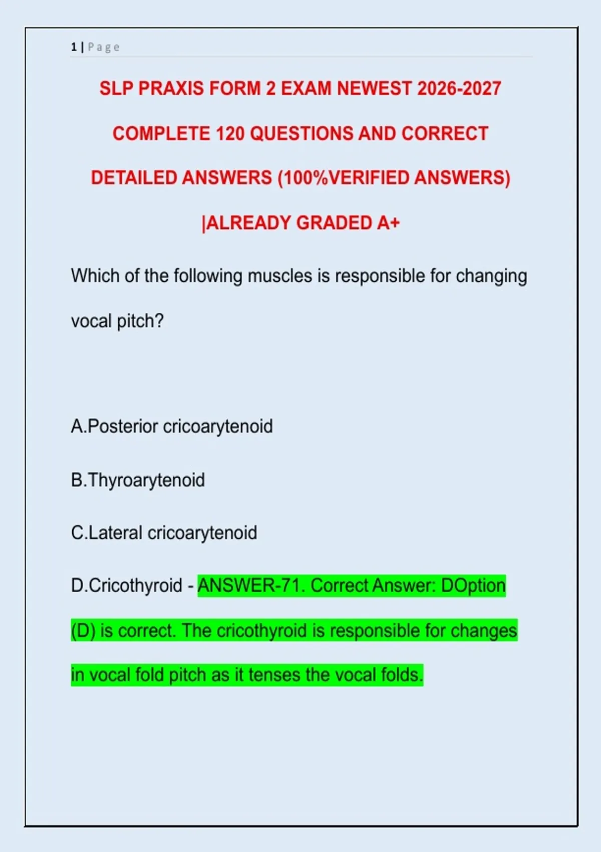 SLP PRAXIS FORM 2 EXAM NEWEST COMPLETE 120 QUESTIONS AND CORRECT DETAILED ANSWERS (100%VERIFIED ANSWERS) |ALREADY GRADED A+
