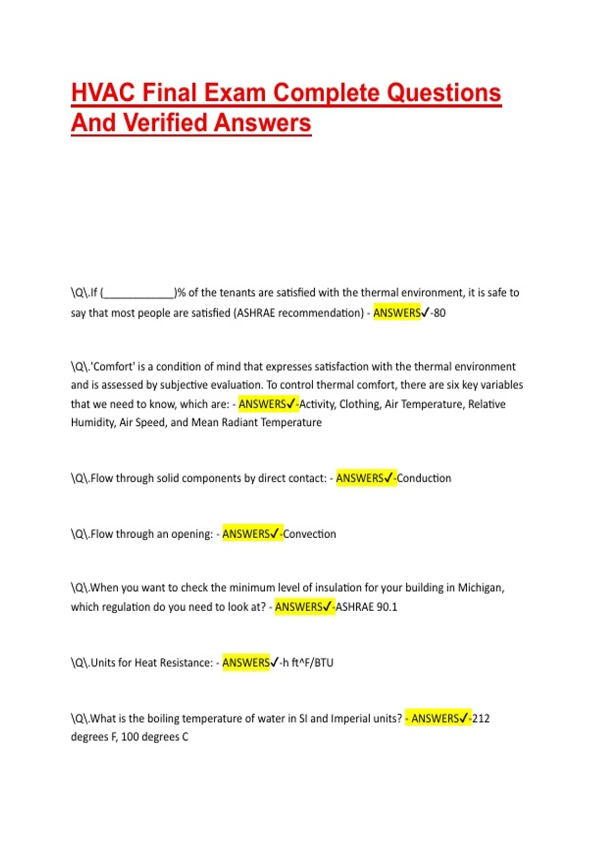 HVAC Final Exam Complete Questions And Verified Answers Q.If (____________)% of the tenants are satisfied with the thermal environment, it is safe to say that most people are satisfied (ASHRAE recommendation) - ANSWERS-80 Q.'Comfort' is a condition of mind that expresses satisfaction with the thermal environment and is assessed by subjective evaluation. To control thermal comfort, there are six key variables that we need to know, which are: - ANSWERS-Activity, Clothing, Air Temperature, Relative Humidity, Air Speed, and Mean Radiant Temperature Q.Flow through solid components by direct contact: - ANSWERS-Conduction Q.Flow through an opening: - ANSWERS-Convection Q.When you want to check the minimum level of insulation for your building in Michigan, which regulation do you need to look at? - ANSWERS-ASHRAE 90.1 Q.Units for Heat Resistance: - ANSWERS-h ft^F/BTU Q.What is the boiling temperature of water in SI and Imperial units? - ANSWERS-212 degrees F, 100 degrees C Q.What is the freezing temperature of water in SI and Imperial units? - ANSWERS-32 degrees F, 0 degrees C Q.What does ASHRAE stand for? - ANSWERS-The American Society of Heating, Refrigerating, and Air-conditioning Engineers Q.What ASHRAE version do we use to double check insulation? - ANSWERS-ASHRAE 90.1 Q.What is Conduction? - ANSWERS-Energy flow through solid components by direct contact Q.What is Convection? - ANSWERS-Energy flow through any opening Q.What is Radiation? - ANSWERS-Energy flow through transparent objects Q.(_______________) is the (hypothetical) uniform temperature of surrounding surfaces with which the human body would exchange the same heat by radiation as occurs in an actual (non-uniform) environment - ANSWERS-Mean Radiant Temperature Q.The graphic representation of the relationship between gases and water vapor in the air is called (________________) - ANSWERS-Psychrometric chart Q.(_________________) heat losses are the result of heat passing through the material in the building envelope (e.g., glass) or through an assembly of materials (e.g., walls, ceilings, floors, and so forth) - ANSWERS-Transmission Q.(_________________) heat losses relate to air leakage through the building envelope and the energy required to heat unconditioned air that has leaked into the structure - ANSWERS-Infiltration