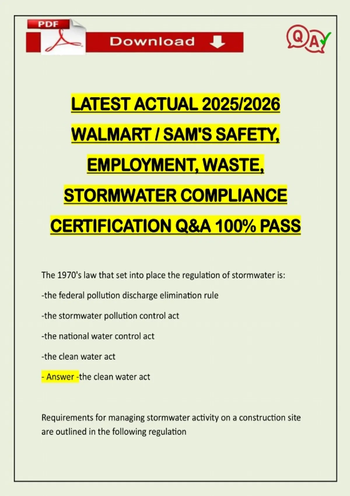 LATEST ACTUAL 2025/2026 WALMART / SAM'S SAFETY, EMPLOYMENT, WASTE, STORMWATER COMPLIANCE CERTIFICATION Q&A 100% PASS The 1970's law that set into place the regulation of stormwater is: -the federal pollution discharge elimination rule -the stormwater pollution control act -the national water control act -the clean water act - Answer -the clean water act Requirements for managing stormwater activity on a construction site are outlined in the following regulationNeed assistance on Online classes, Exams & Assignments? Reach out for instant help!! Full Course Assistance, Plagiarism-free Essay Writing, Research Paper, Dissertation, Discussion Posts, etc…. Confidential & Secure services. Tutors are available for all subjects! Email now at: -NOI -NPDES -NOT -DOT - Answer -NPDES Which of the following is never an allowable stormwater discharge from a construction site? -discharge from b