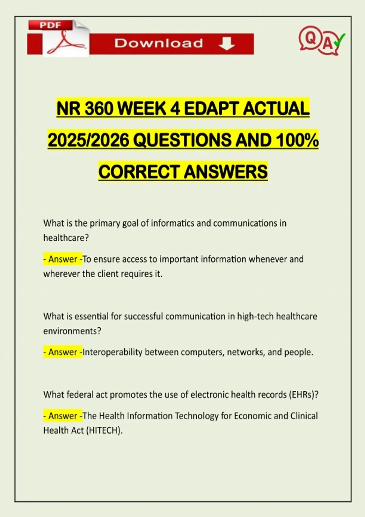 NR 360 WEEK 4 EDAPT ACTUAL 2025/2026 QUESTIONS AND 100% CORRECT ANSWERS What is the primary goal of informatics and communications in healthcare? - Answer -To ensure access to important information whenever and wherever the client requires it. What is essential for successful communication in high-tech healthcare environments? - Answer -Interoperability between computers, networks, and people. What federal act promotes the use of electronic health records (EHRs)? - Answer -The Health Information Technology for Economic and Clinical Health Act (HITECH).Need assistance on Online classes, Exams & Assignments? Reach out for instant help!! Full Course Assistance, Plagiarism-free Essay Writing, Research Paper, Dissertation, Discussion Posts, etc…. Confidential & Secure services. Tutors are available for all subjects! Email now at: What does the HITECH Act encourage healthcare providers to do? - Answer -Transition from paper records to electronic health records (EHRs) to improve efficiency and care coordination. What are some outcomes promoted by effective communication in healthcare? - Answer -Client-centered care, optimal health outcomes, prevention of adverse events, and client safety